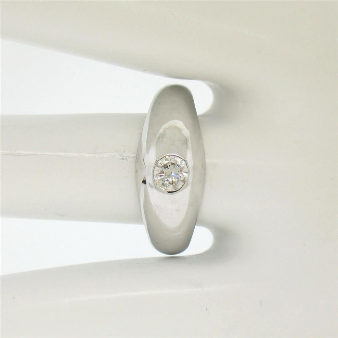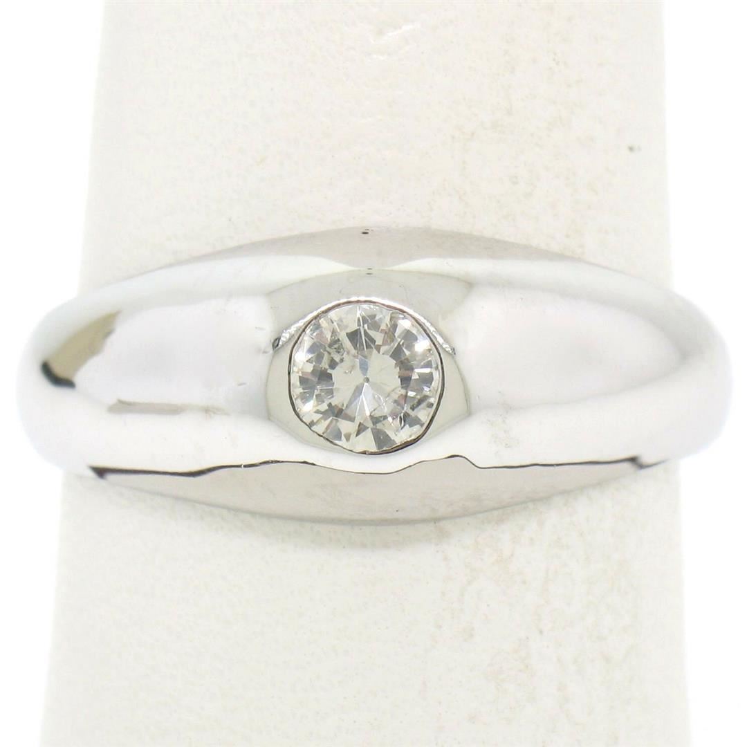 An excellent condition 14kt white gold band ring bezel set with a 0.25ct round diamond (H - SI2). The ring is size 8, weighs a total of 6.3 grams, and measures approximately 8.5mm wide.