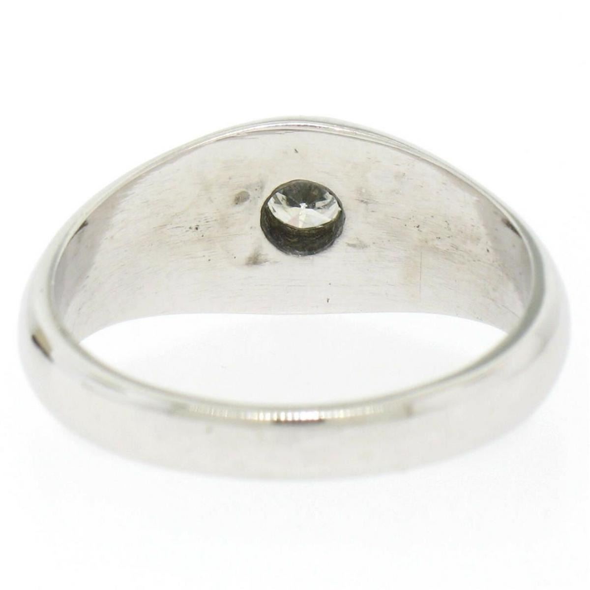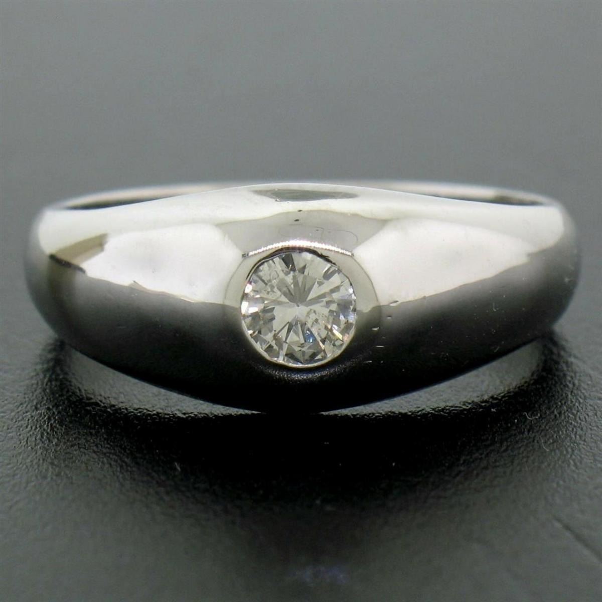 An excellent condition 14kt white gold band ring bezel set with a 0.25ct round diamond (H - SI2). The ring is size 8, weighs a total of 6.3 grams, and measures approximately 8.5mm wide.