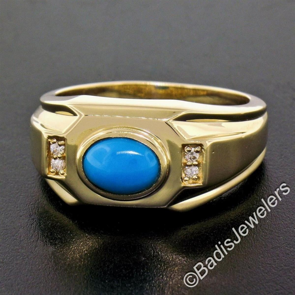 A men's 14kt yellow gold ring with an 8.2x6.0mm oval turquoise and 0.05ctw of round diamonds (F - VS2). The ring is size 11.5, weighs a total of 10.92 grams, and measures 11.75mm wide.