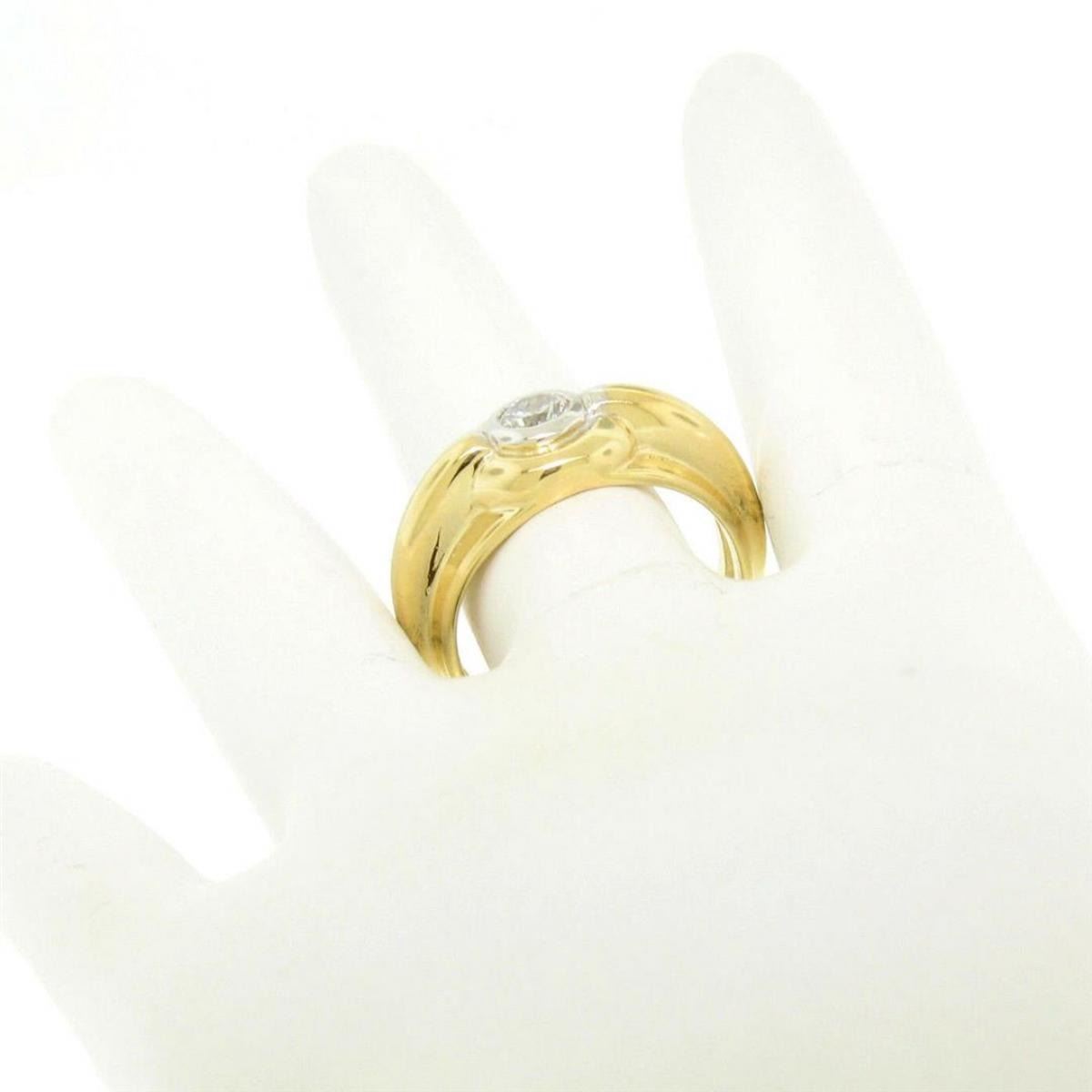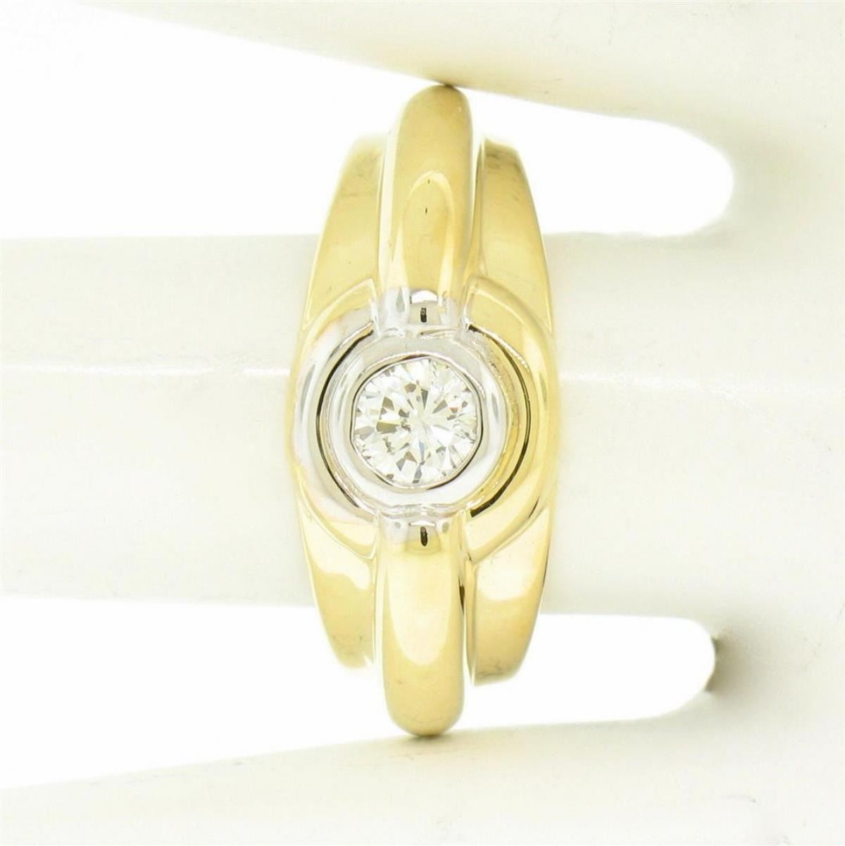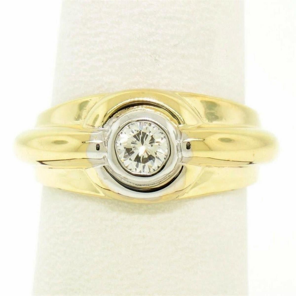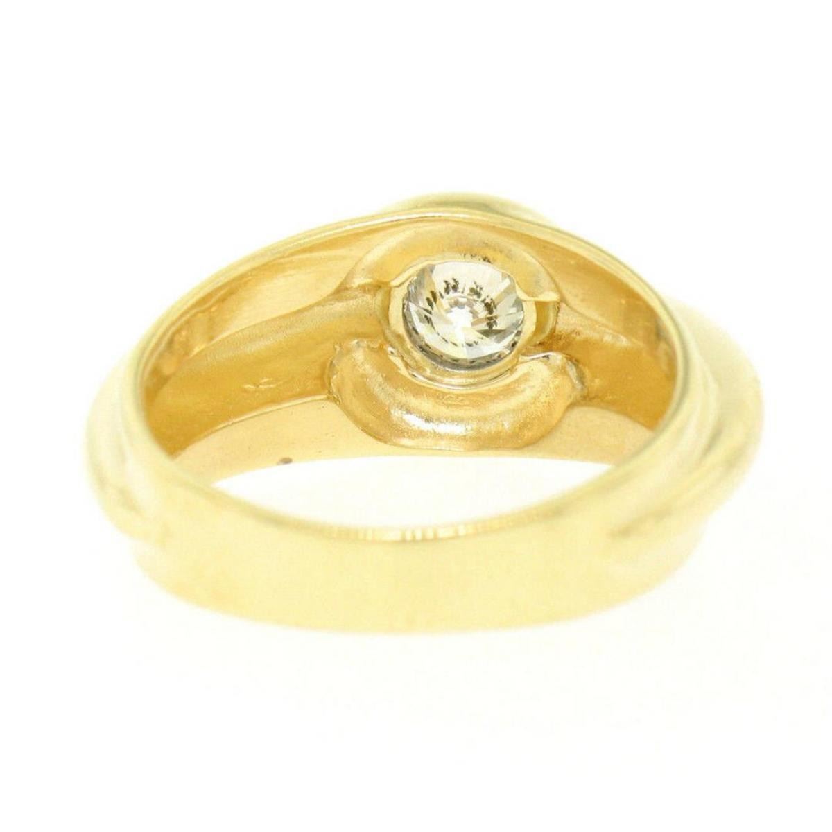 A like new men's 14kt yellow gold band ring bezel set with a 0.40ct round diamond (F - SI1). The ring is size 7, weighs a total of 6.4 grams, and measures 9.55mm wide.