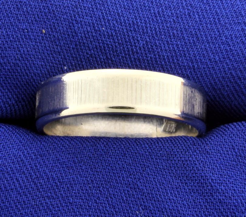 In 18K white gold, it is 5.8mm wide. It has "P.C.P. 06-03-05" engraved on the inside. Size 11 1/2 6.1g