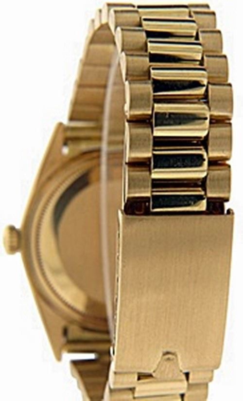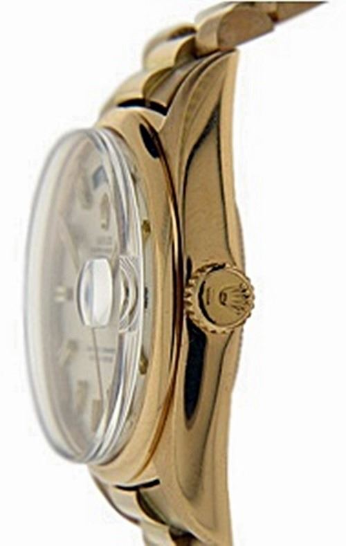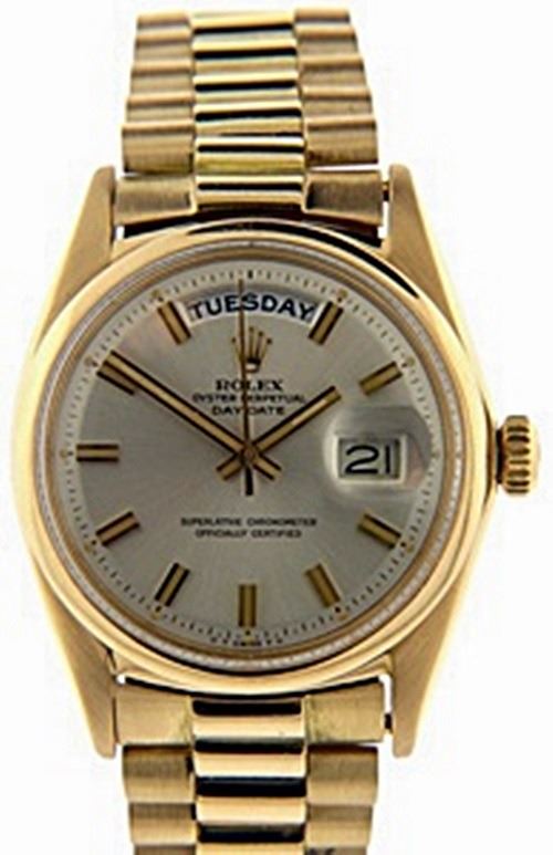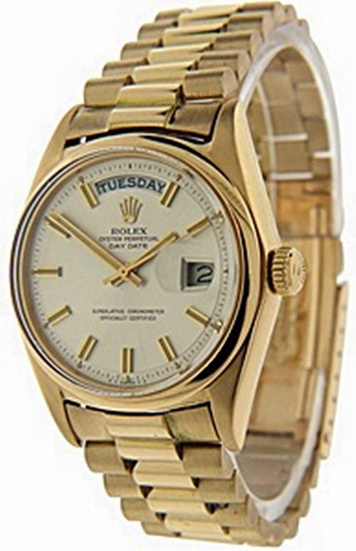 Manufacturer: Rolex , Model Name: Day-Date , Gender: Men's , Circa: 1970 , Condition: Pre-Owned, Excellent Overall Condition. Polished and Overhauled (Full Service) , Case: 18K Yellow Gold, 36mm Width , Movement: Automatic , Dial: Original Rolex Day-Date Silver Face , Bezel: 18K Yellow Gold. Smooth , Crown: 18K Yellow Gold , Bracelet/Strap: Original Rolex Band, The Clasp was repaired and piece that fits nail to open it is missing, 18K Yellow Gold, Oyster Crystal: Acrylic , Calander: Day-Date , Day Wheel Custom Refinshed, Box/Papers: NOT AVAILABLE Inv. Ref#109677