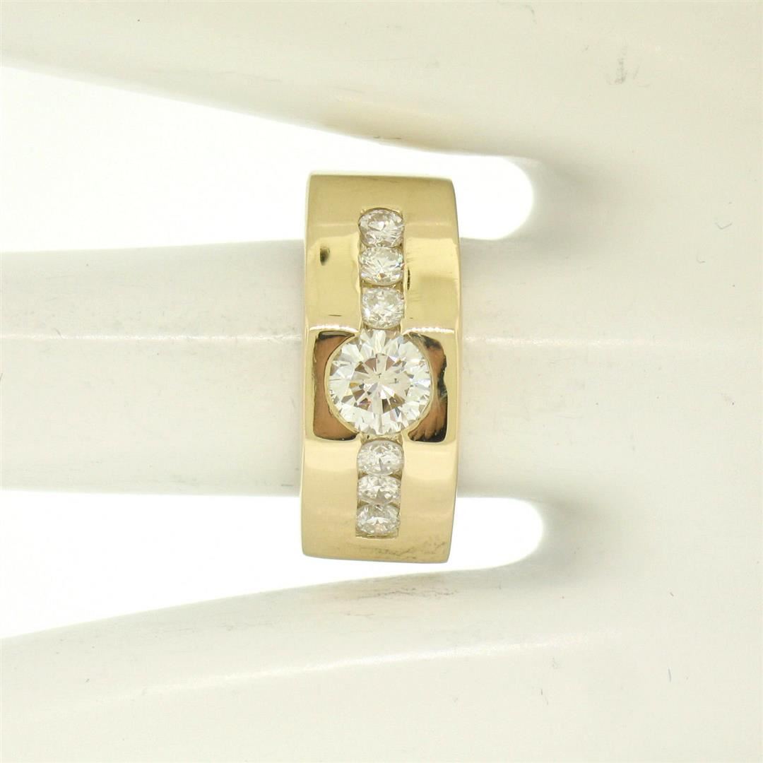 One Men's 18K Yellow Gold 1.01ctw Round Brilliant Cut Solitaire Diamond Band Ring. Item Details: Material: Solid 18K Yellow Gold, Weight: 6.85 Grams, Stone(s): (1) Natural Genuine Diamond - Round Brilliant Cut - Half-Bezel Set - G Color - VS2 Clarity - 0.56ct (approx.), (6) Natural Genuine Diamonds - Round Brilliant Cut - Channel Set - G Color - VS1/VS2 Clarity - 0.45ctw (approx.), Total Carat Weight: 1.01 (approx.), Ring Size: 7.0, Ring Width: 8.22mm, Ring Height: 4.81mm rise off the finger. Condition: Like New!