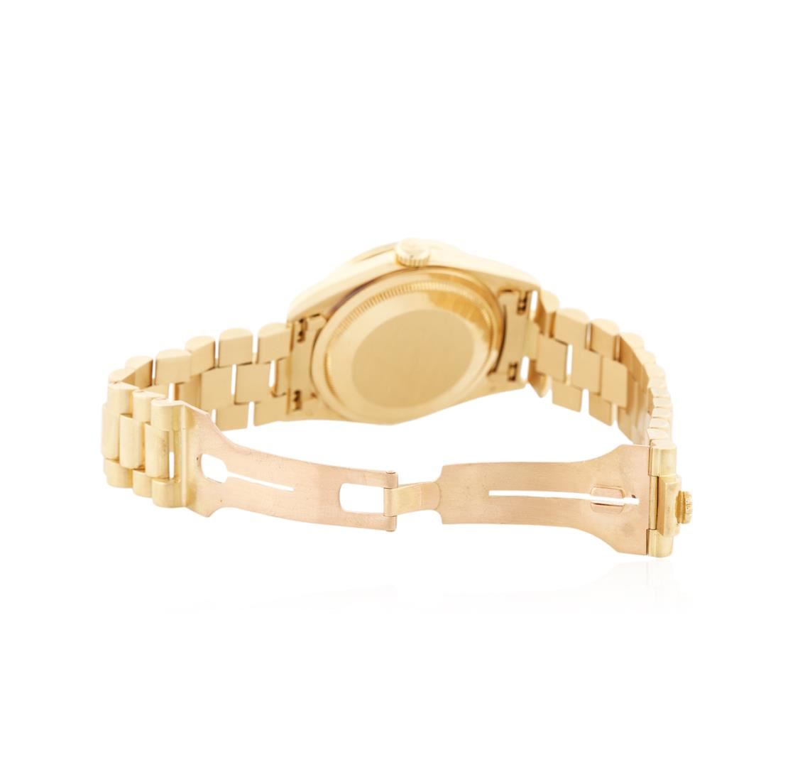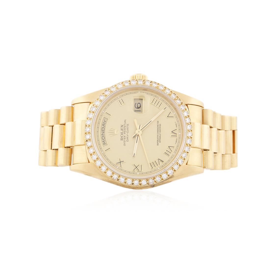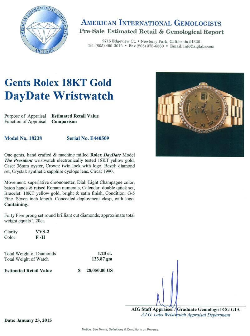 One gents, hand crafted & machine milled Rolex DayDate Model The President wristwatch electronically tested 18KT yellow gold, Case: 36mm oyster, Crown: twin lock with logo, Bezel: diamond set, Crystal: synthetic sapphire cyclops lens. Circa: 1990.Movement: superlative chronometer, Dial: Light Champagne color, baton hands & raised Roman numerals, Calendar: double quick set, Bracelet: 18KT yellow gold, bright & satin finish, Condition: G-5 Fine. Seven inch length. Concealed deployment clasp, with logo. Containing: Forty Five prong set round brilliant cut diamonds, approximate total weight equals 1.20ct. Clarity VVS-2. Color: F -H. Total Weight of Diamonds 1.20ct. Total Weight of Watch 133.87 grams. AIG Appraised at $28,050.00.