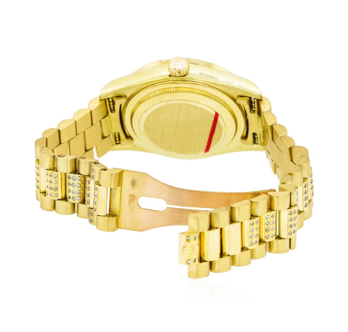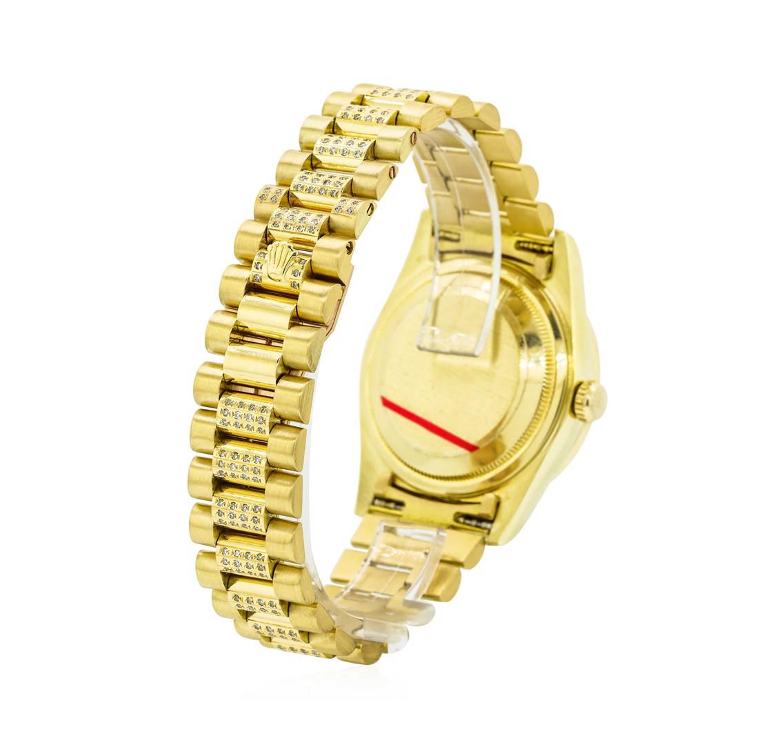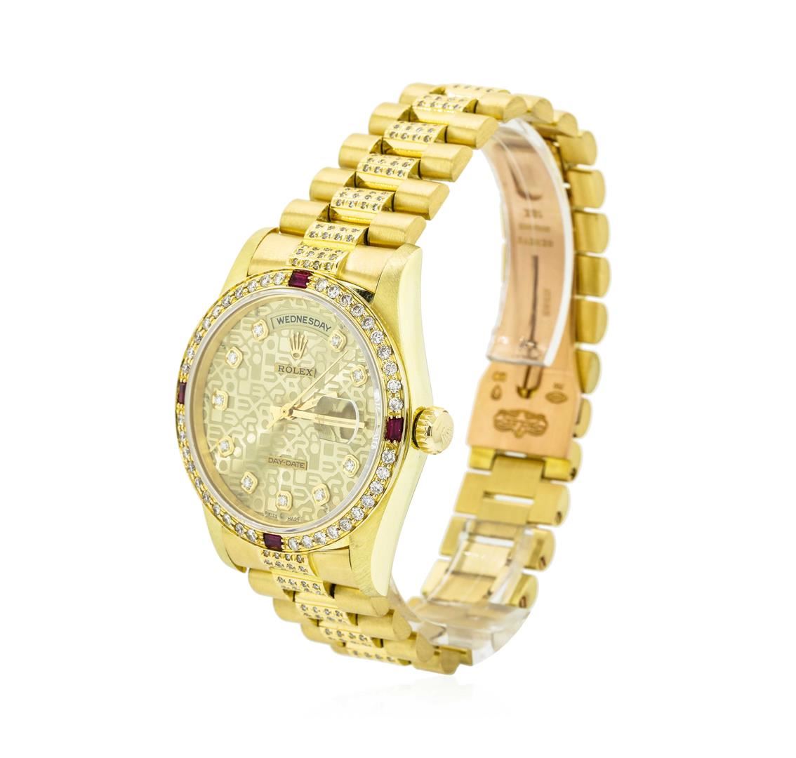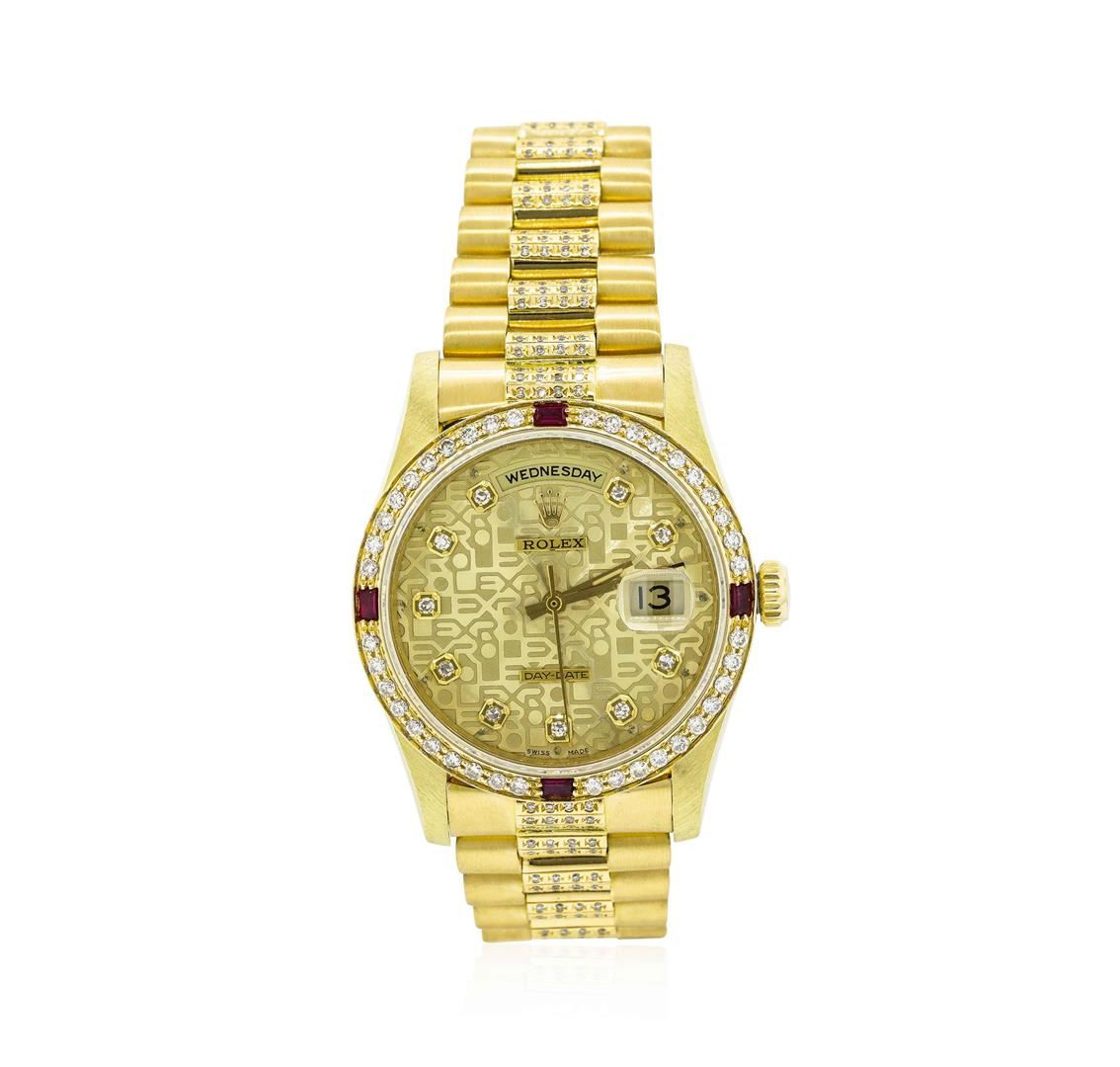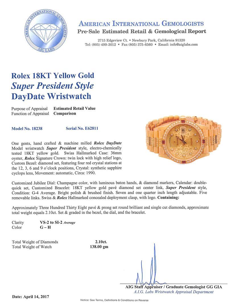 One gents, hand crafted & machine milled Rolex DayDate Model wristwatch Super President style, electro-chemically tested 18KT yellow gold. Swiss Hallmarked Case: 36mm oyster, Rolex Signature Crown: twin lock with high relief logo, Custom Bezel: diamond set, featuring four red crystal stations at the 12, 3, 6 and 9 o'clock positions, Crystal: synthetic sapphire cyclops lens, Movement: automatic, Circa: 1990.Customized Jubilee Dial: Champagne color, with luminous baton hands, & diamond markers, Calendar: double-quick set, Customized Bracelet: 18KT yellow gold pave diamond set center link, Super President style, Condition: G-4 Average. Bright polish & brushed finish. Seven and one quarter inch length adjustable. Five removable links. Swiss & Rolex Hallmarked concealed deployment clasp, with logo. Containing: Approximately Three Hundred Thirty Eight pave & prong set round brilliant and single cut diamonds, approximate total weight equals 2.10ct. Set & graded in the bezel, the dial, and the bracelet. Clarity VS-2 to SI-2 Average. Color: G - H. Total Weight of Diamonds 2.10ct. Total Weight of Watch 138.00gm. AIG Appraised.