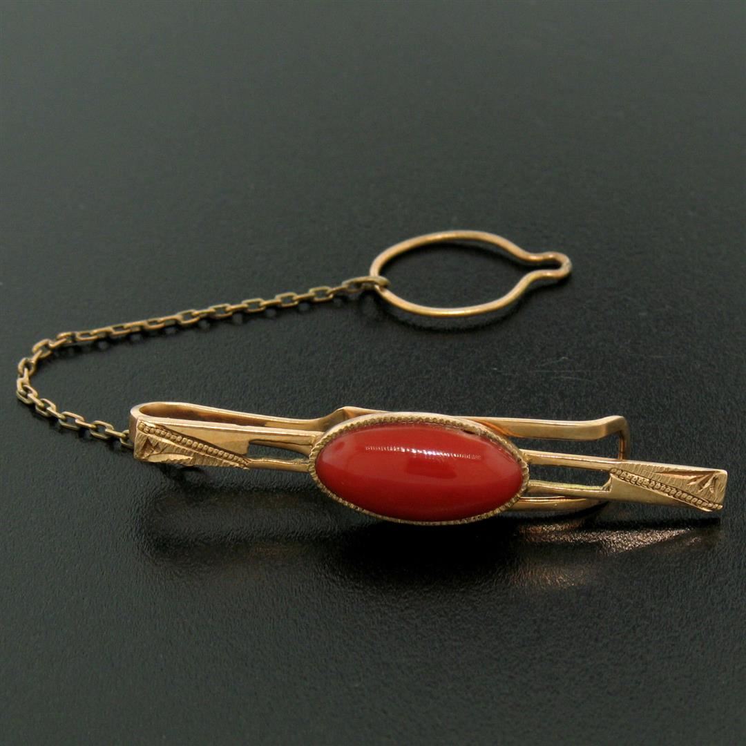 One Men's Vintage 18k Rose Gold Cabochon Red Ox Blood Coral Tie Clasp w/ Button Loop. Item Details: Material: 18k Solid Rose Gold, Total Weight: 2.8 Grams, Stone(s): (1) Natural Genuine Coral - Oval Cabochon Cut - Rich, Ox Blood Red Color - 6.87x13.79mm (approx.), Overall Height: 7.91mm, Overall Width: 40.80mm, Overall Thickness: 9.46mm, Chain Length: 46.63mm (approx. 1 7/8"), Condition: Vintage piece. Excellent condition!