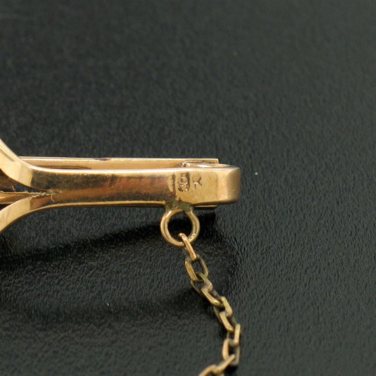 One Men's Vintage 18k Rose Gold Cabochon Red Ox Blood Coral Tie Clasp w/ Button Loop. Item Details: Material: 18k Solid Rose Gold, Total Weight: 2.8 Grams, Stone(s): (1) Natural Genuine Coral - Oval Cabochon Cut - Rich, Ox Blood Red Color - 6.87x13.79mm (approx.), Overall Height: 7.91mm, Overall Width: 40.80mm, Overall Thickness: 9.46mm, Chain Length: 46.63mm (approx. 1 7/8"), Condition: Vintage piece. Excellent condition!