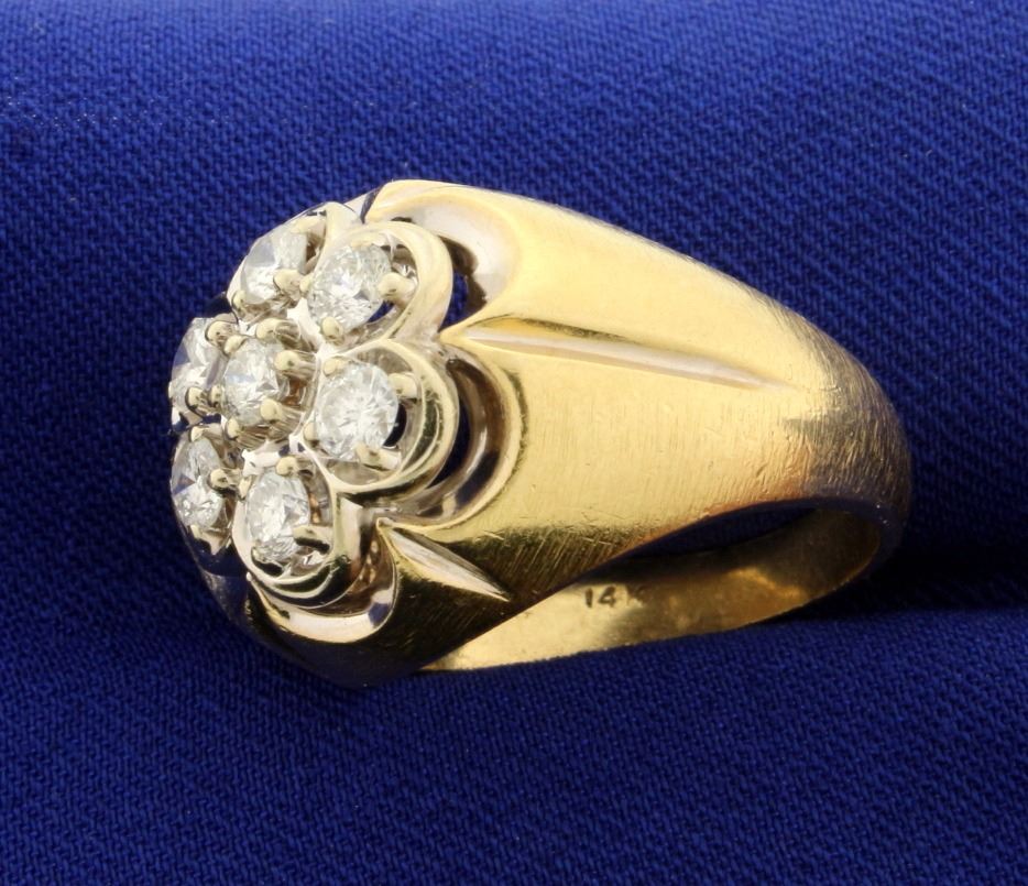In 14k yellow gold. Contains seven .15ct high quality diamonds of SI clarity/G color. Size 10. 13.0g.