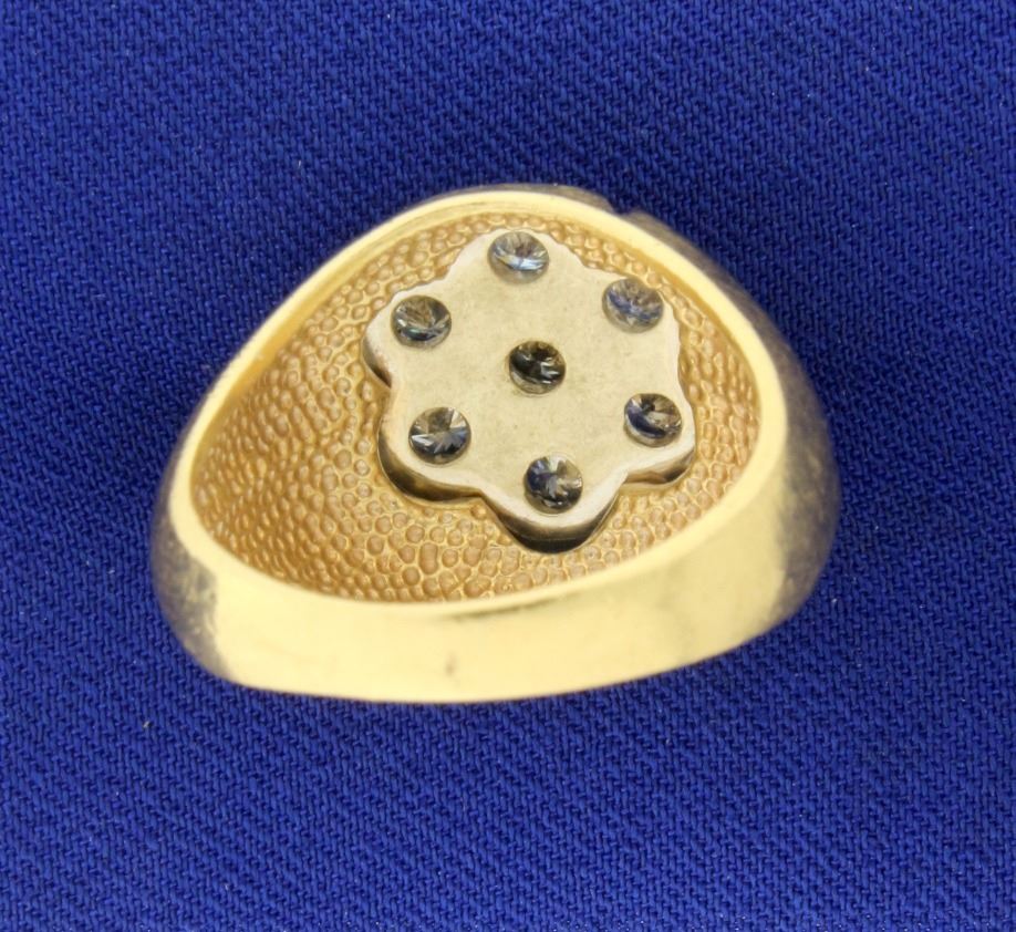 In 14k yellow gold. Contains seven .15ct high quality diamonds of SI clarity/G color. Size 10. 13.0g.