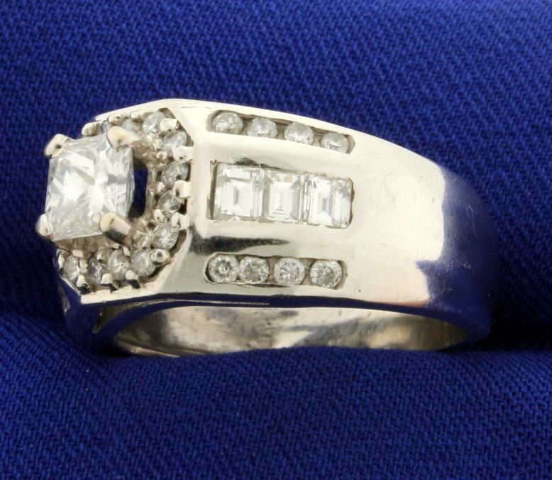 In 14k white gold, center diamond is 1.1ct princess cut diamond with very high quality VVS clarity/F color. Surrounded by 1.4ct TW of high quality round and baguette diamond of SI clarity/F color. Size 10 1/2. 12.0g.