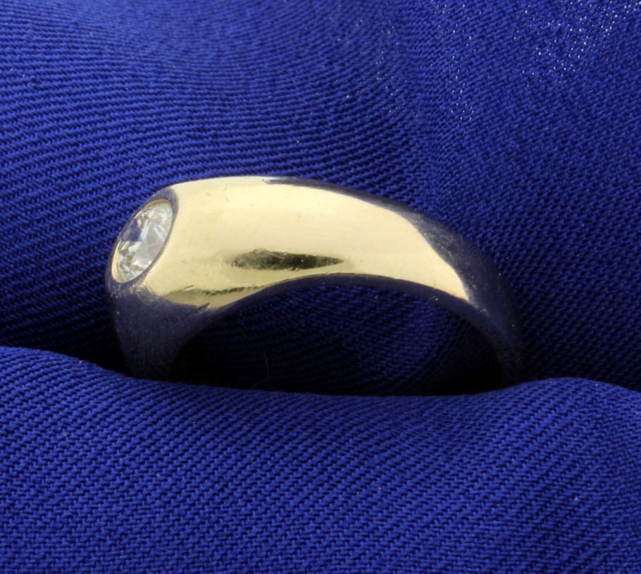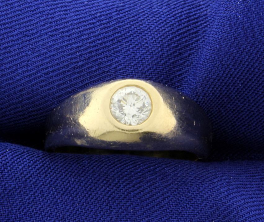 In 14K yellow gold, the 2/3ct high quality round brilliant diamond is VS clarity/I color, has great sparkle and life. Size 10 11.0g