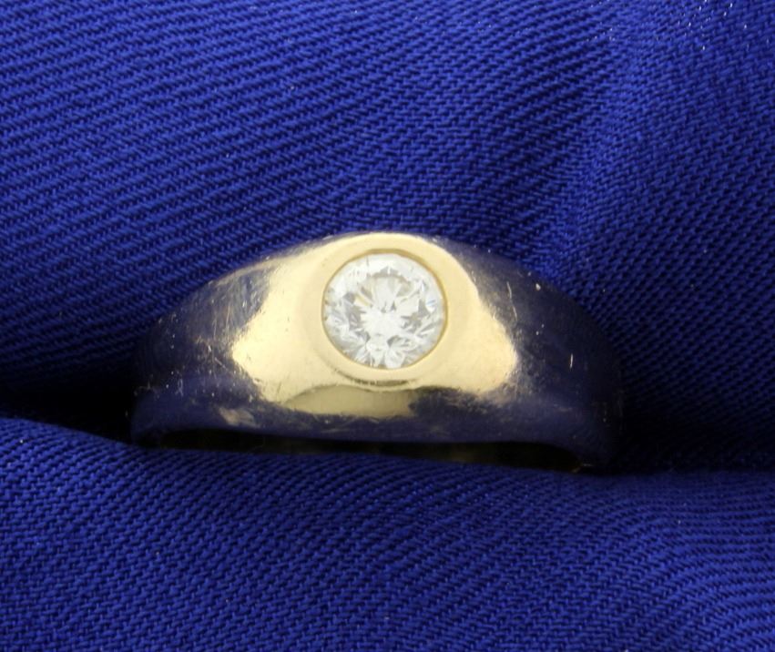 In 14K yellow gold, the 2/3ct high quality round brilliant diamond is VS clarity/I color, has great sparkle and life. Size 10       11.0g