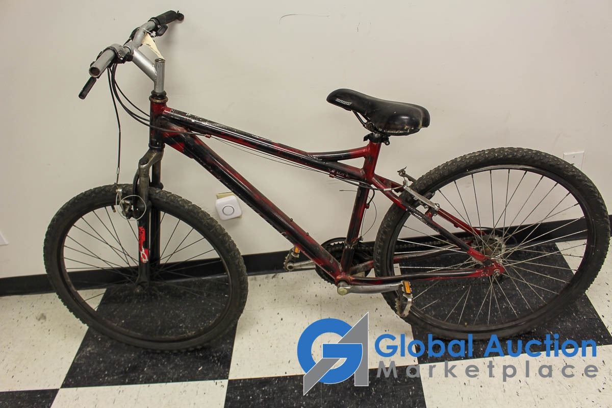 No front brake; back brake tries real hard to work; missing handle bar grip; custom paint job; mismatched tires; back tire is flat.