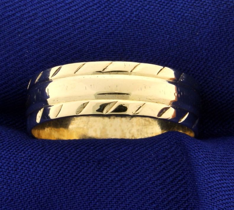 In 14k yellow gold, with unique pattern. Size 12 1/2. 7.2mm wide. 6.2g.