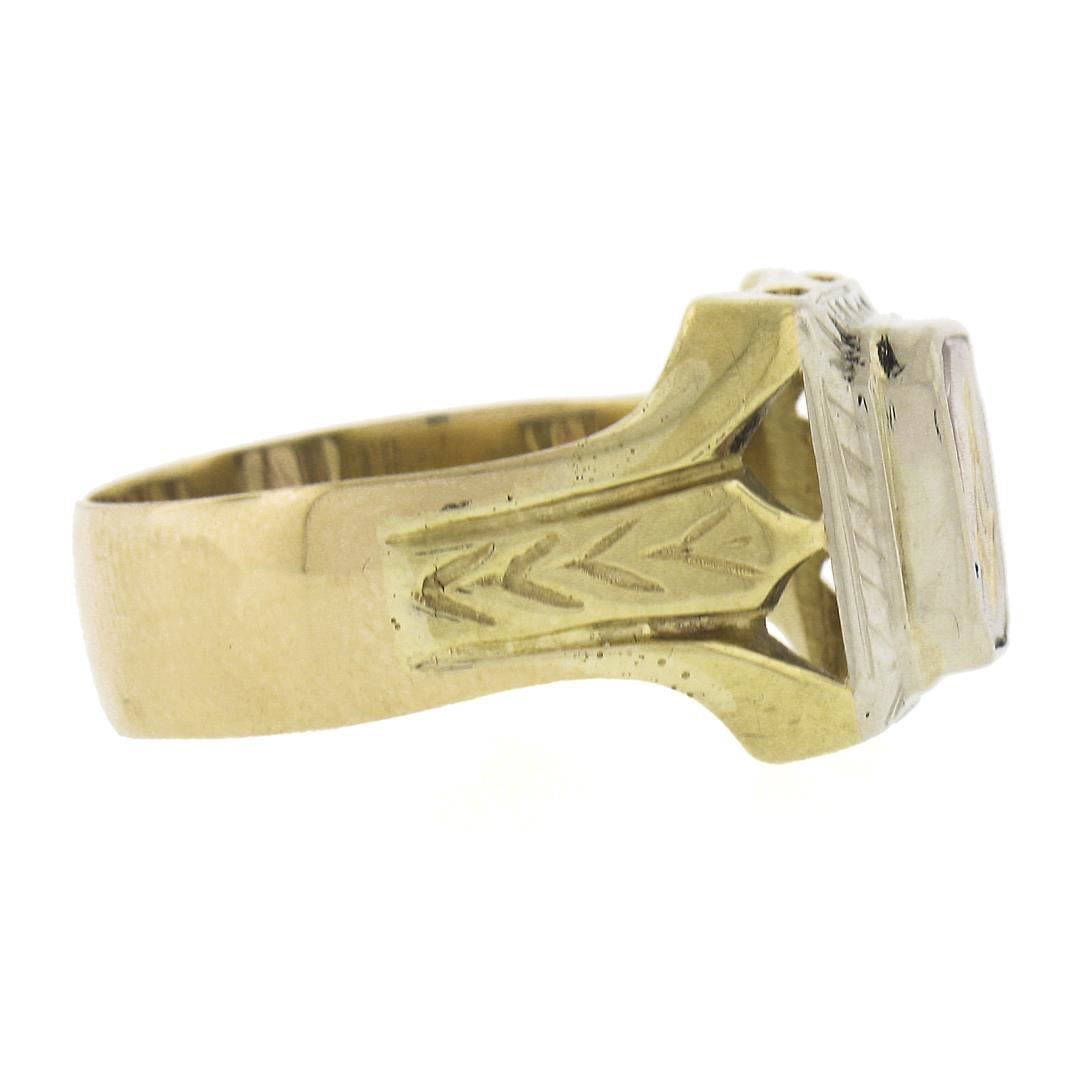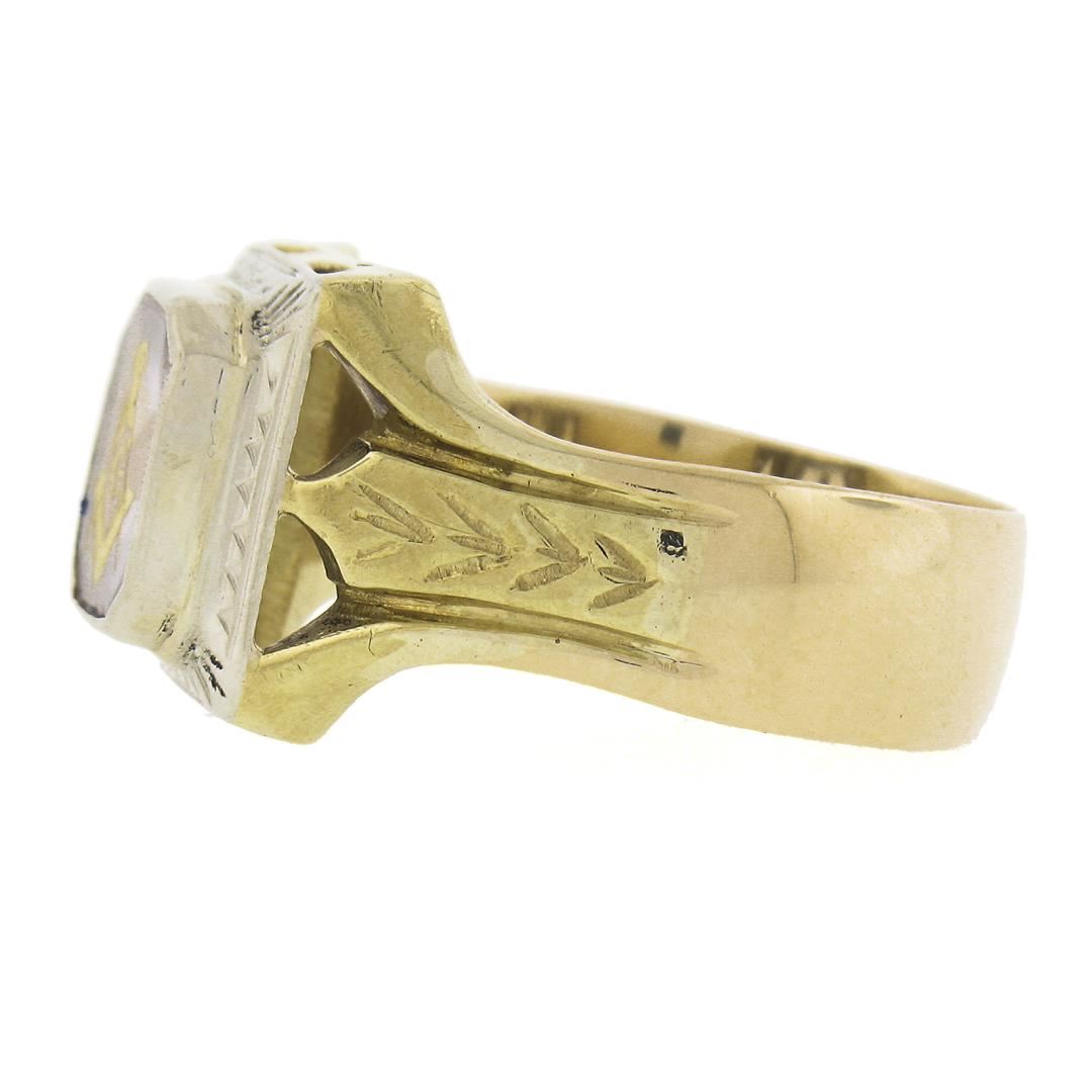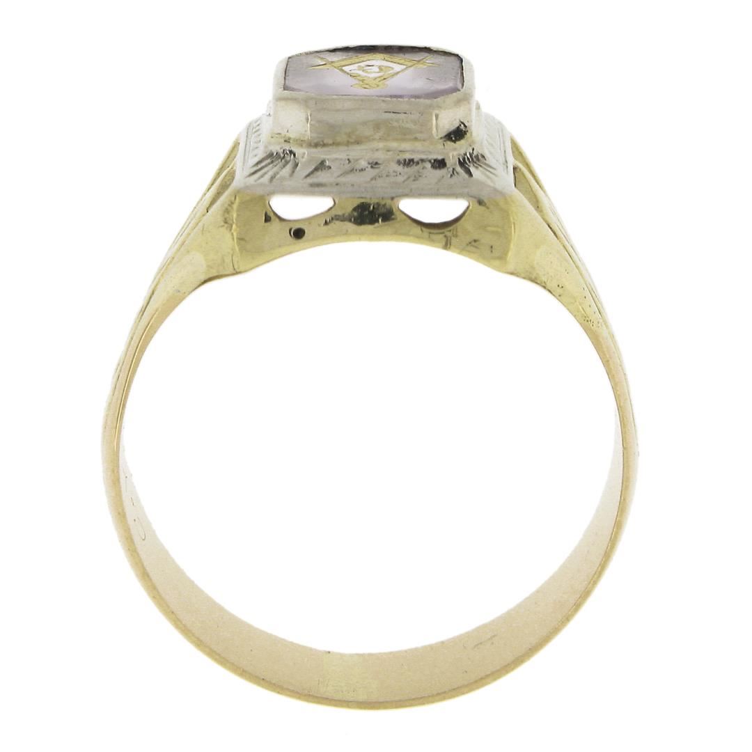 An antique solid 14k yellow & white gold men's masonic ring, with 1 rectangular cut natural amethyst (9.5x7.9mm). The ring is size 12, weighs a total of 7.43 grams, and measures 14mm wide.
