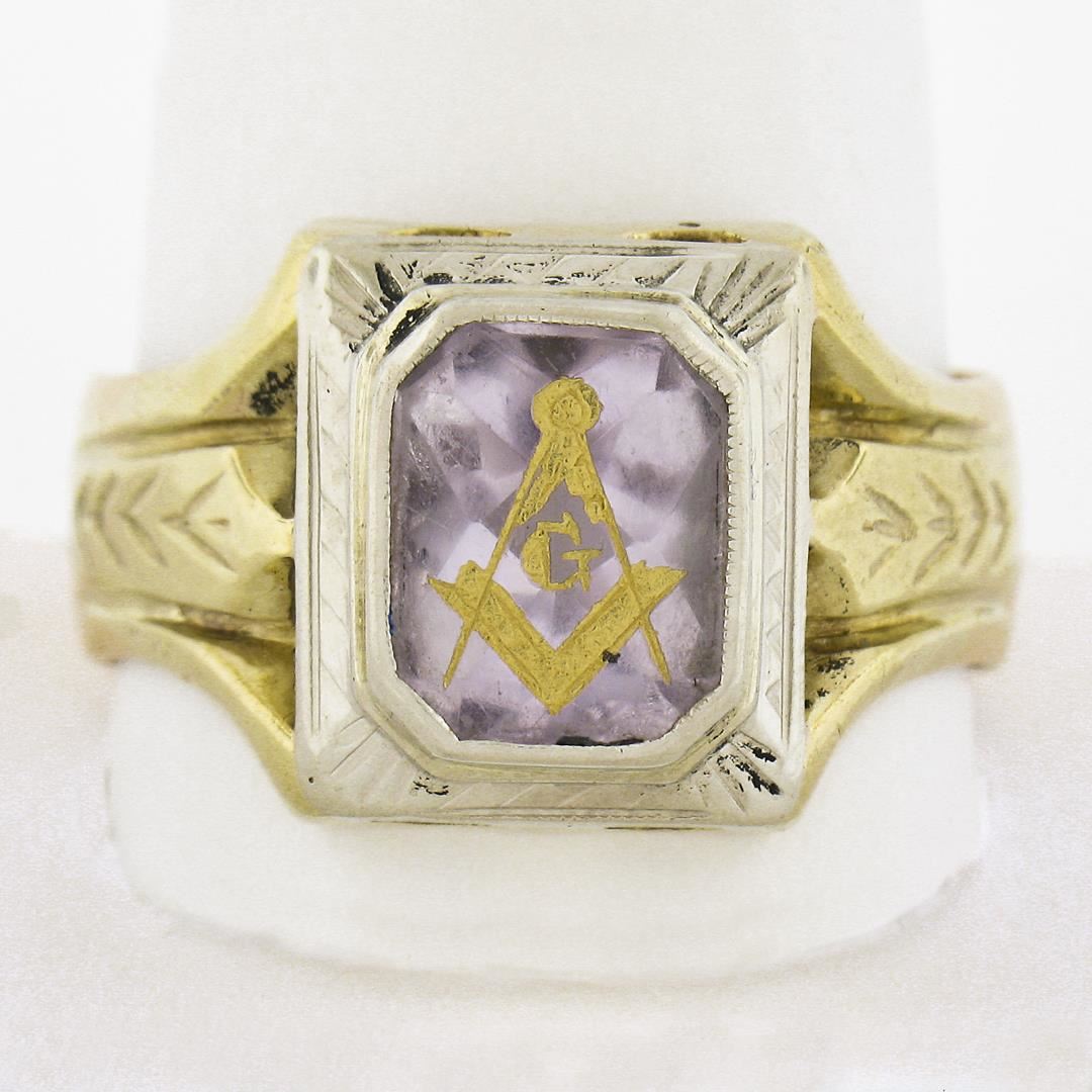 An antique solid 14k yellow & white gold men's masonic ring, with 1 rectangular cut natural amethyst (9.5x7.9mm). The ring is size 12, weighs a total of 7.43 grams, and measures 14mm wide.