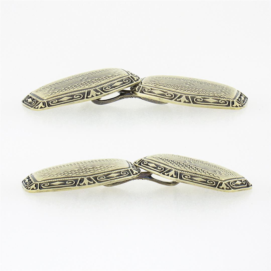 An antique solid 14k yellow gold etched engraved cufflinks. These cuff links have a linking bar design with a clearance of 15.10mm, weigh a total of 6.0 grams, and the front panels measure 16.6x12.5mm.