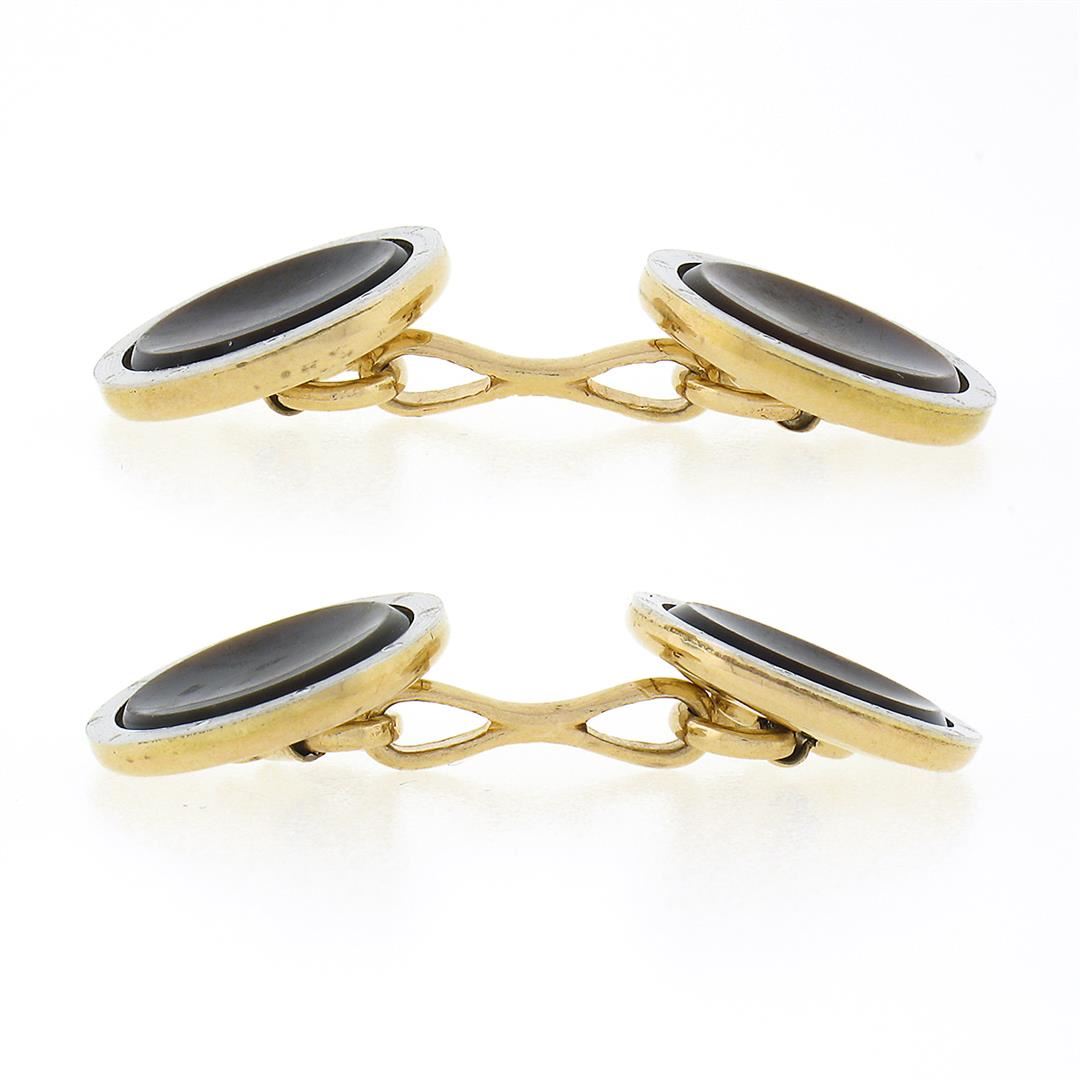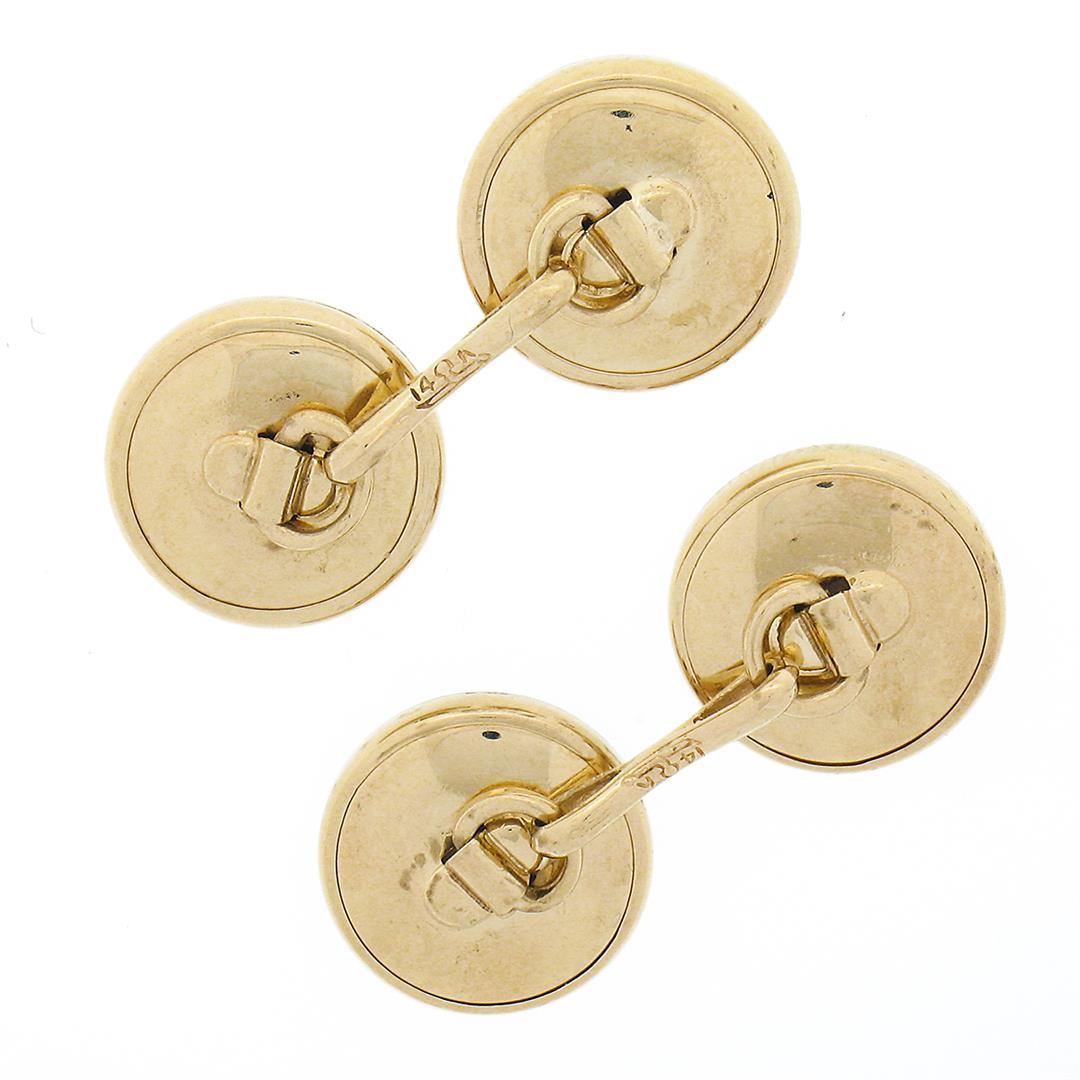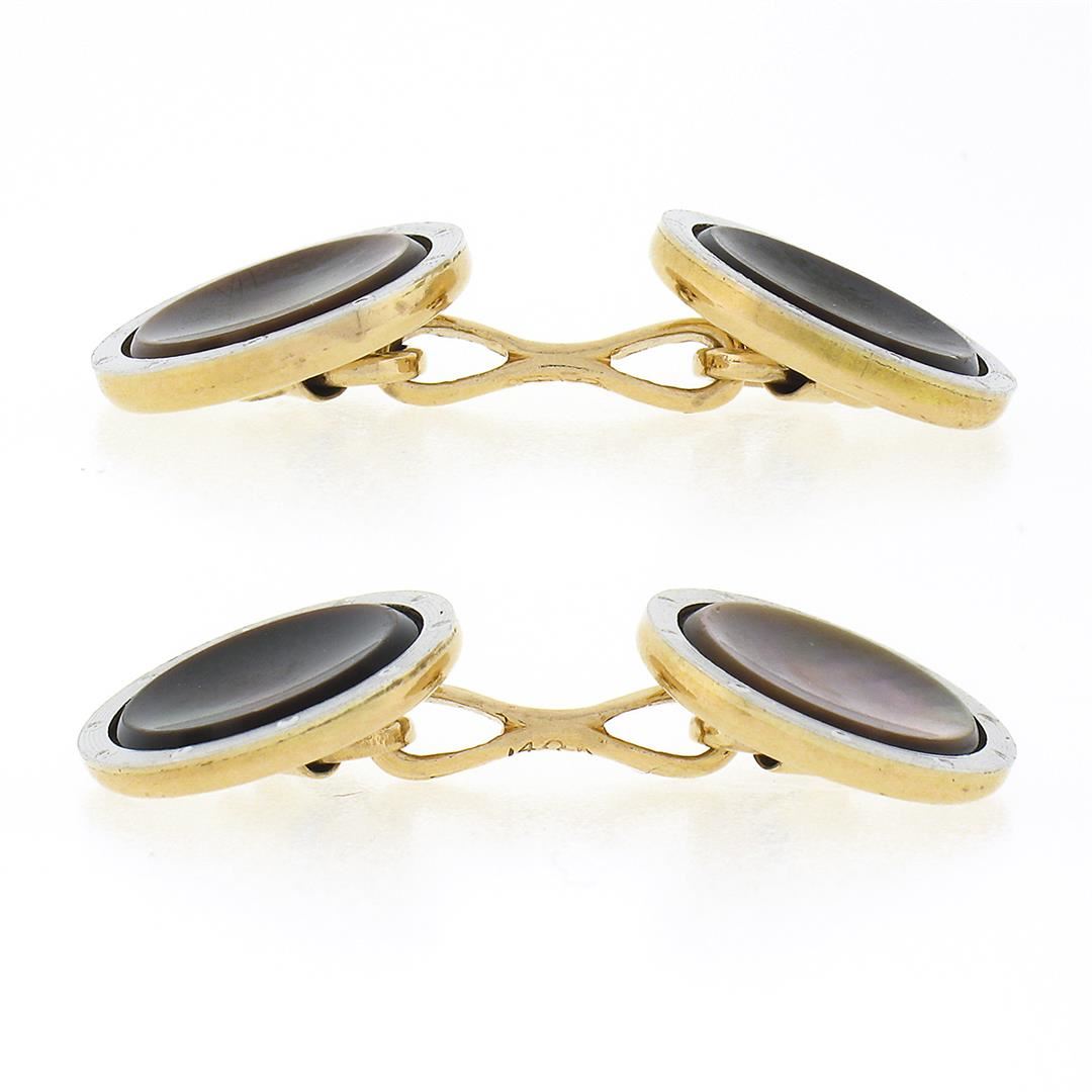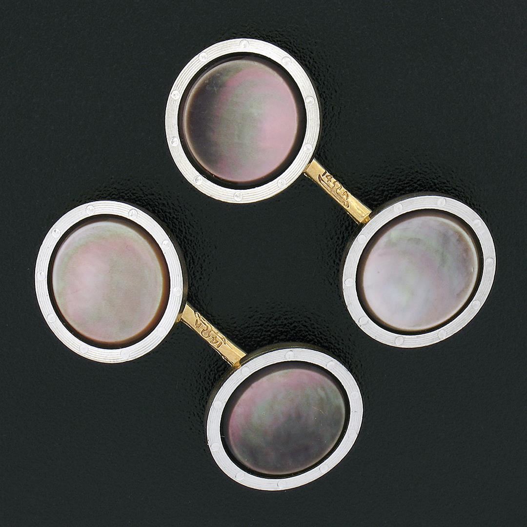 An antique solid 14k yellow and white gold grooved cufflinks, with 4 rouns shape mother of pearls (10.1mm). These cuff links have a linking bar design with a clearance of 14.30mm, weigh a total of 5.70 grams, and the front panels measure 12.60mm.