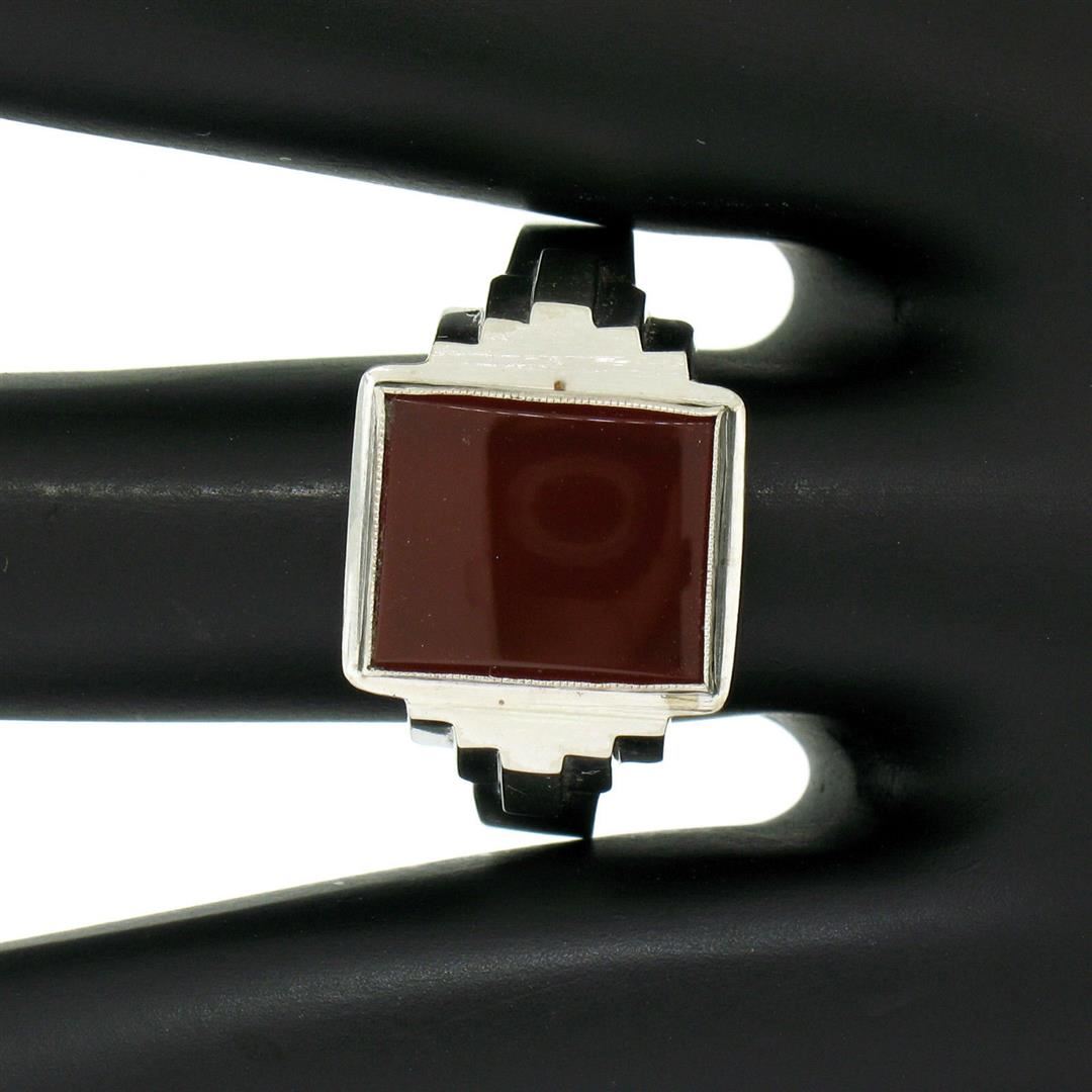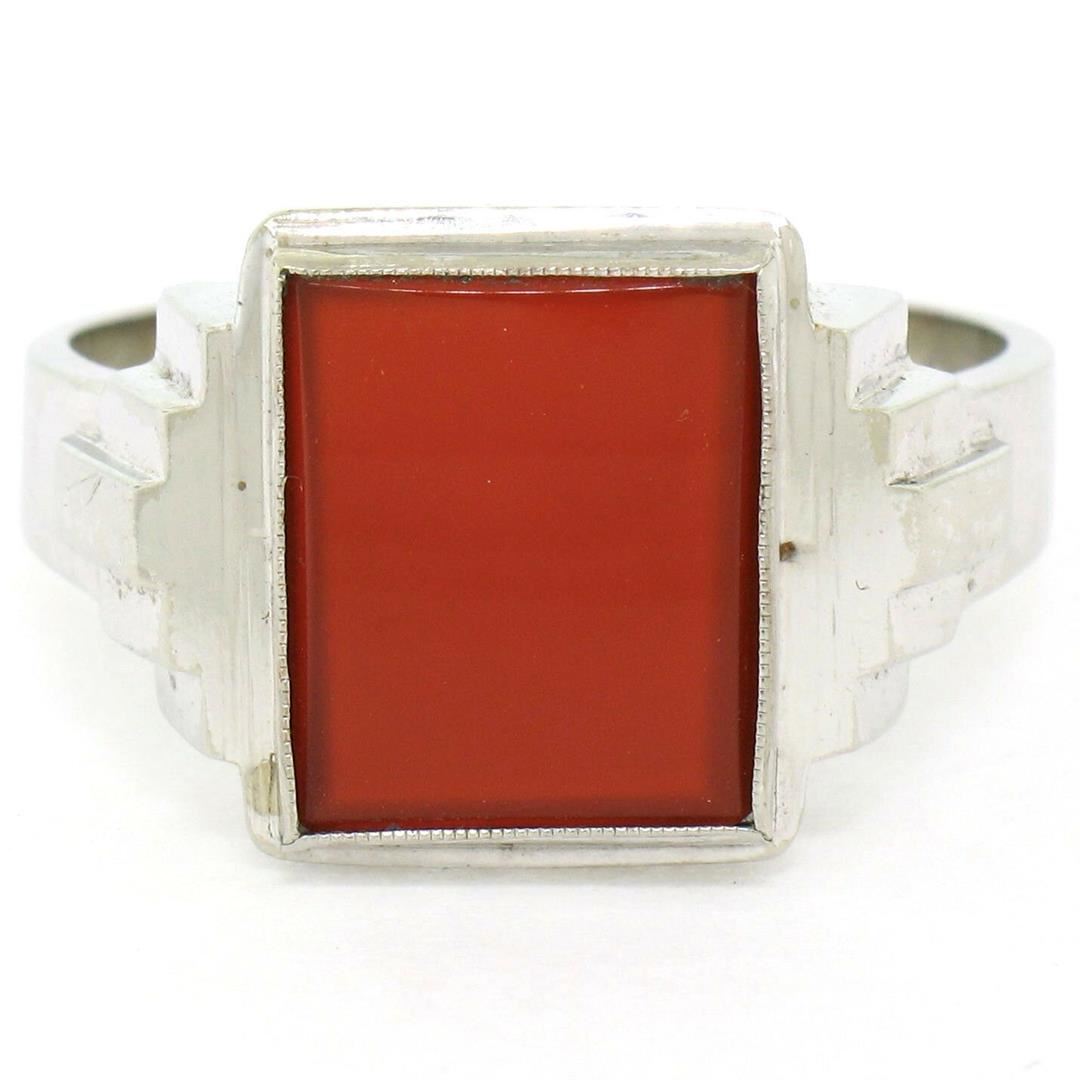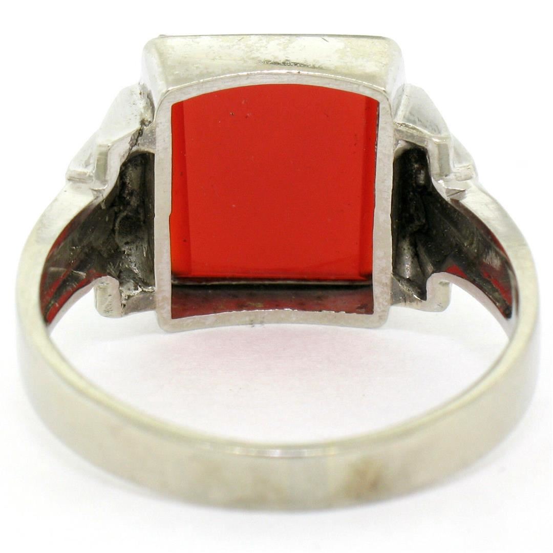 One Men's Antique 14k White Gold Rectangular Cut Carnelian Solitaire Ring Size 10.5. Item Details: Material:  14K Solid White Gold, Weight:  6.16 Grams, Stone(s):  (1) Natural Genuine Carnelian - Rectangular Cut - Bezel Set - Deep Brownish Red Color - 11.55x10mm (approx.), Ring Size:  10.5 , Ring Width:  13.85mm, Ring Height:  4.40mm rise off the finger, Condition:  Antique piece. Great, ready to wear condition!,