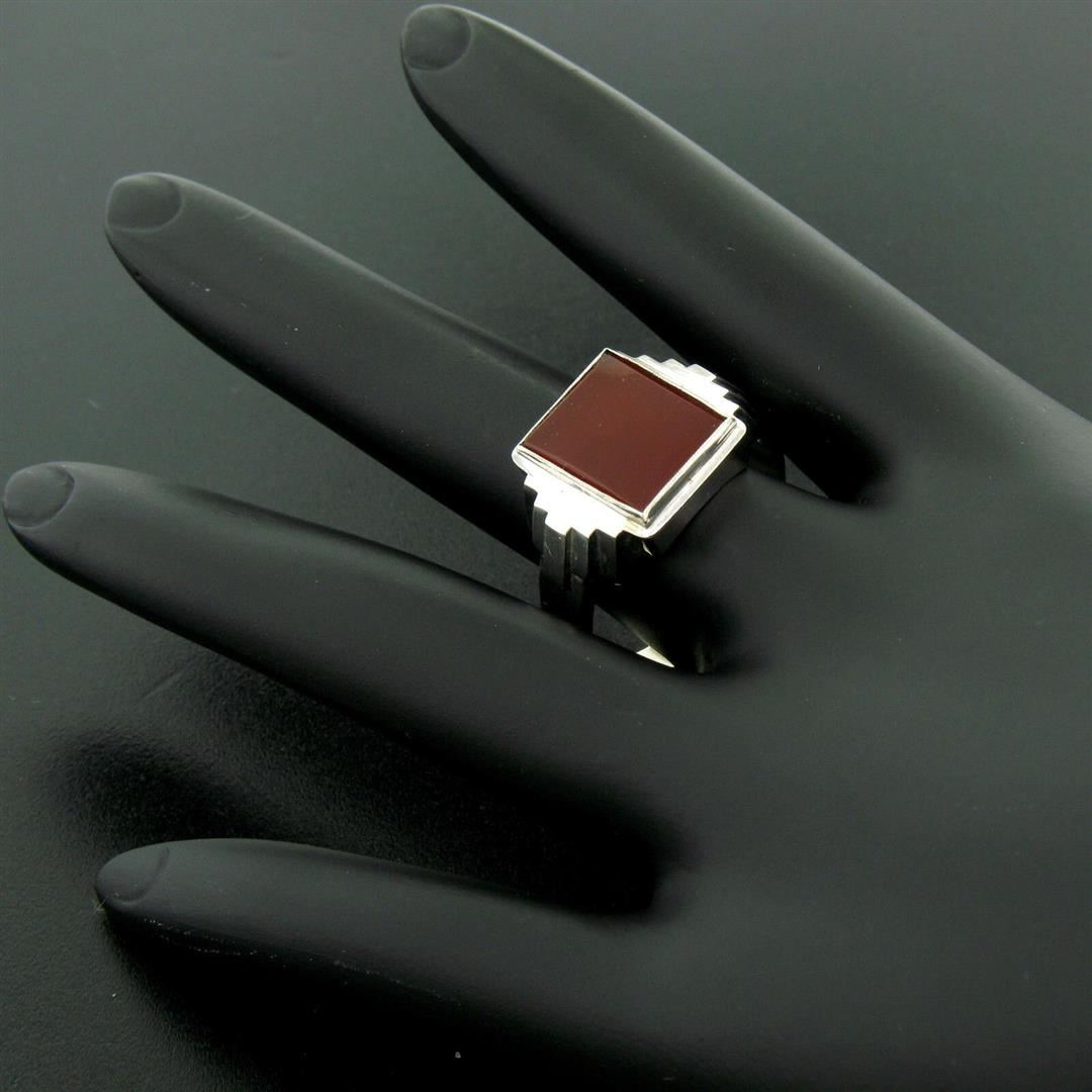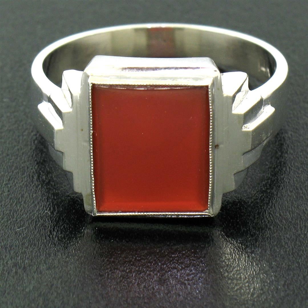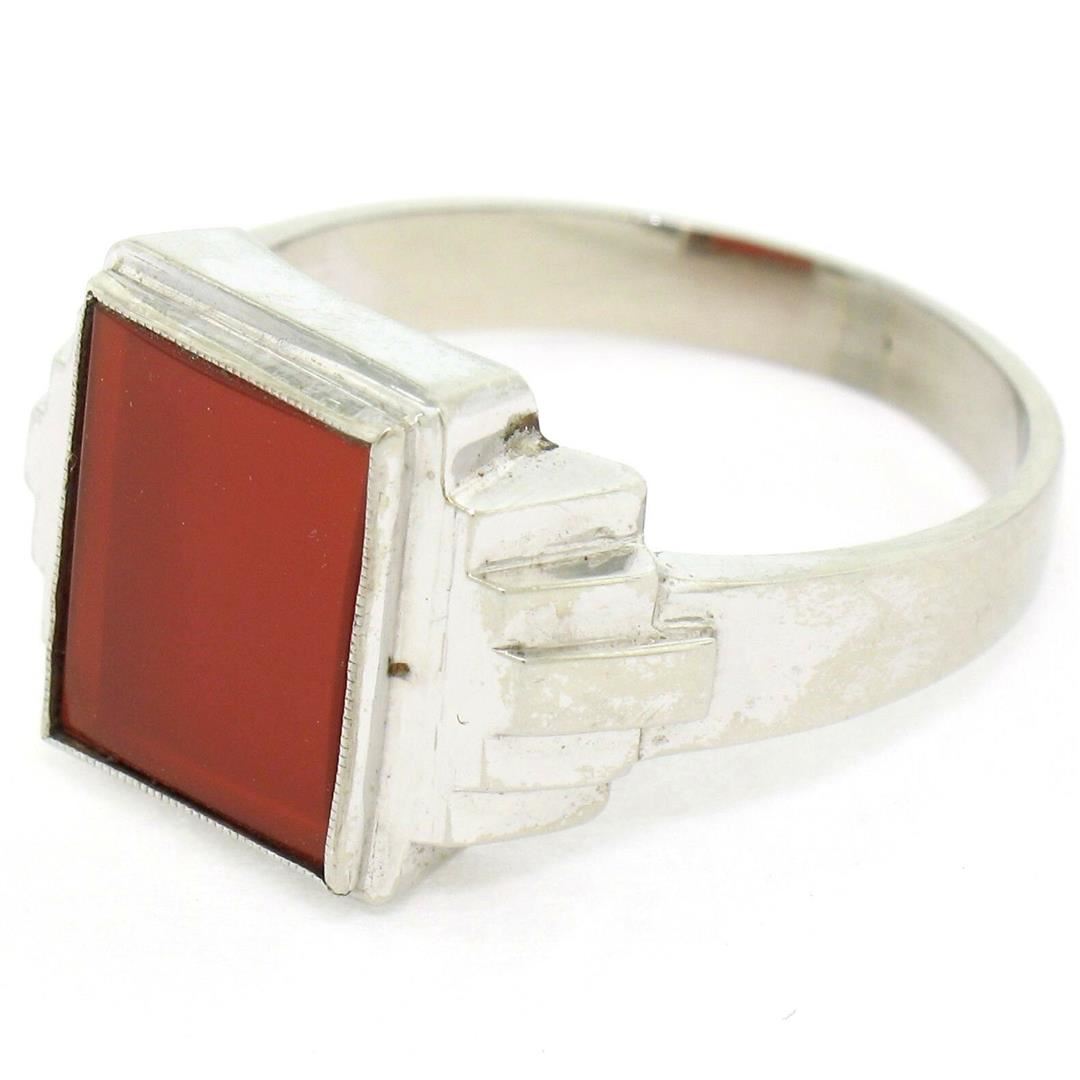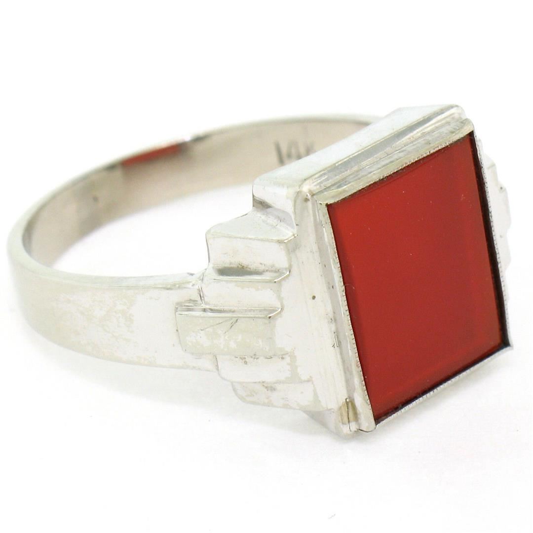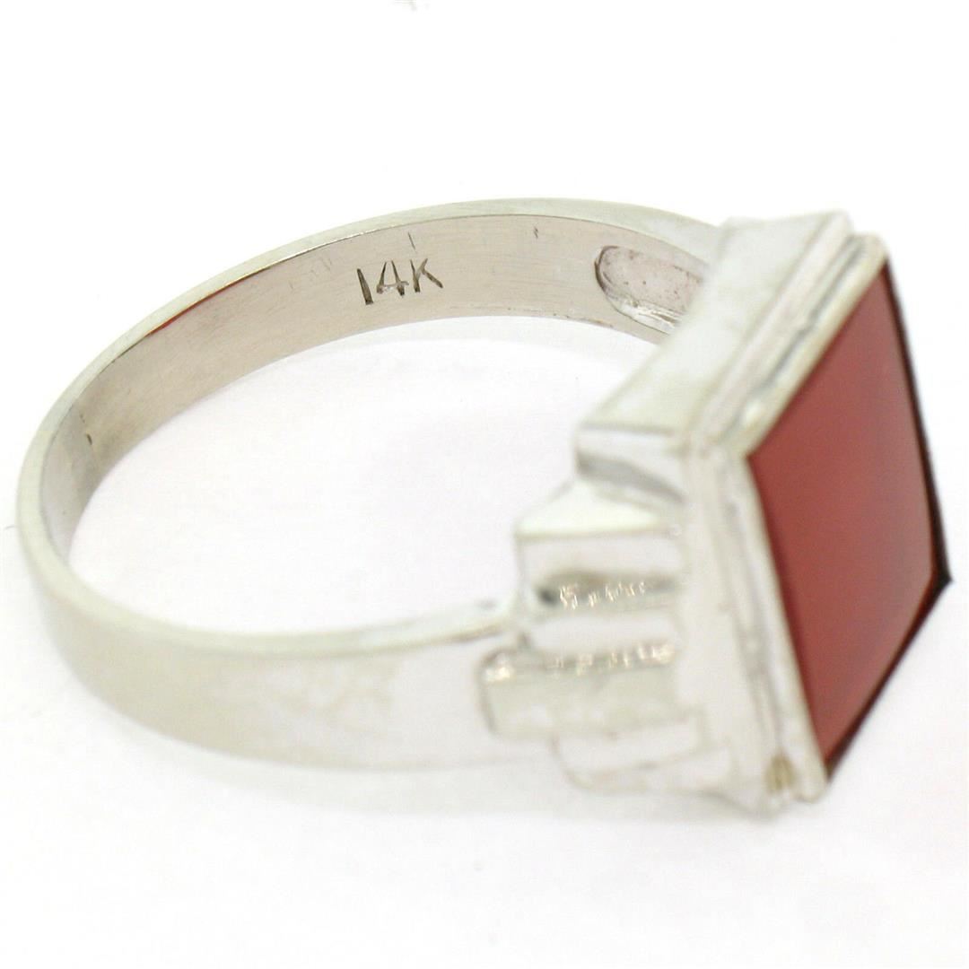 One Men's Antique 14k White Gold Rectangular Cut Carnelian Solitaire Ring Size 10.5. Item Details: Material: 14K Solid White Gold, Weight: 6.16 Grams, Stone(s): (1) Natural Genuine Carnelian - Rectangular Cut - Bezel Set - Deep Brownish Red Color - 11.55x10mm (approx.), Ring Size: 10.5 , Ring Width: 13.85mm, Ring Height: 4.40mm rise off the finger, Condition: Antique piece. Great, ready to wear condition!,
