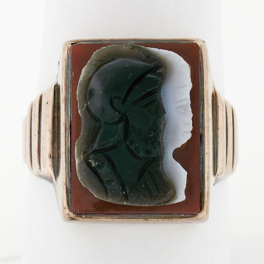 Men's Antique Victorian 10k Gold Carved Trojan Agate on Carnelian Cocktail Ring