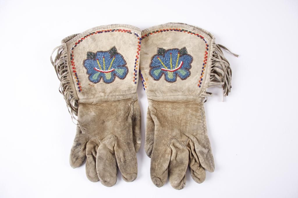 Men's Beaded GauntletsFloral beaded design on leather, fringed, overall good, shows age.