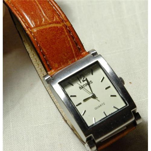 Nice Benrus Men's watch in excellent condition. The brush steel case is 1 1/16 x 1 3/4 from lug to lug. The lugs are hinged for a more comfort fit. The movement is Japanese. It has a sweeping second hand. It comes on an attracitve patterned leather band that measure a total of 9 5/8" long including the buckle. <p> The watch comes to you working excellently with a working quartz battery.