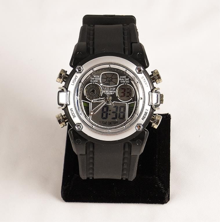 Men's Black Digital Sports Watch. Watch Has A Quartz Movement With And Analog Display On Black Face. Watch Displays Hours, Minutes, And Days. Time Is Displayed In Digital Numbers And Analog. It Also Has El Back Light Function To Display The Time Clearly In Darkness. Watch Band Is Made Out Of Durable Heavy Duty Plastic. Water Proof Up To 30 Meters.
