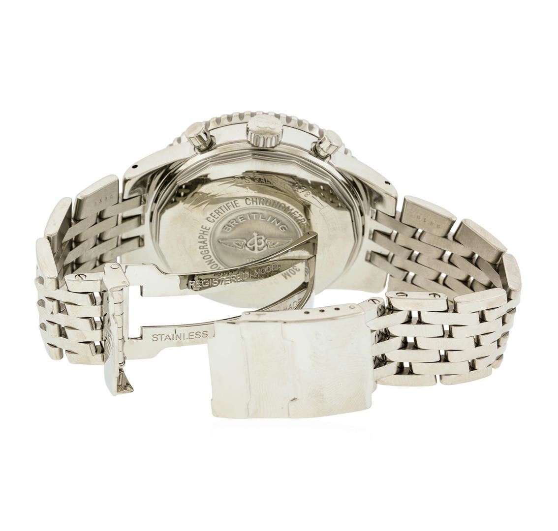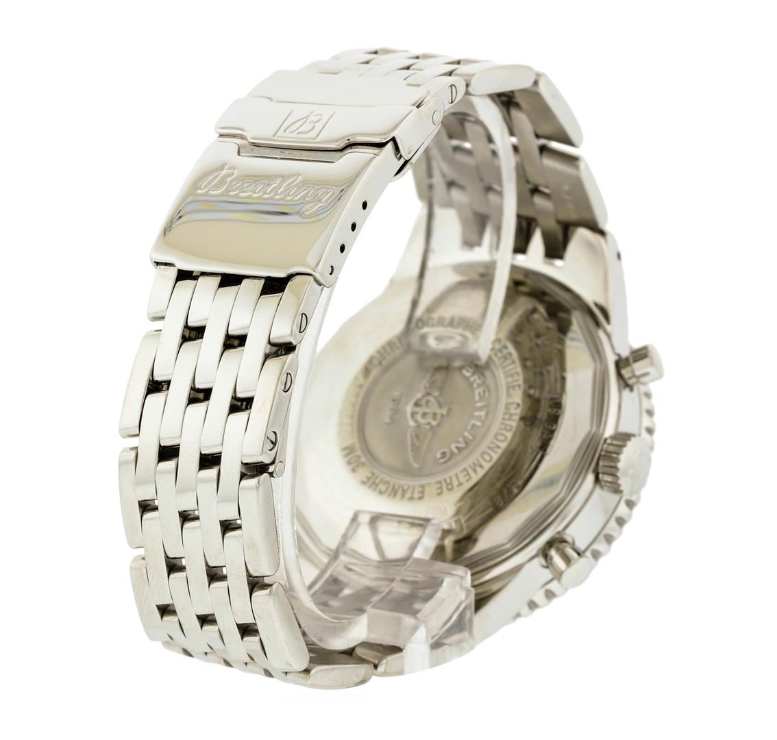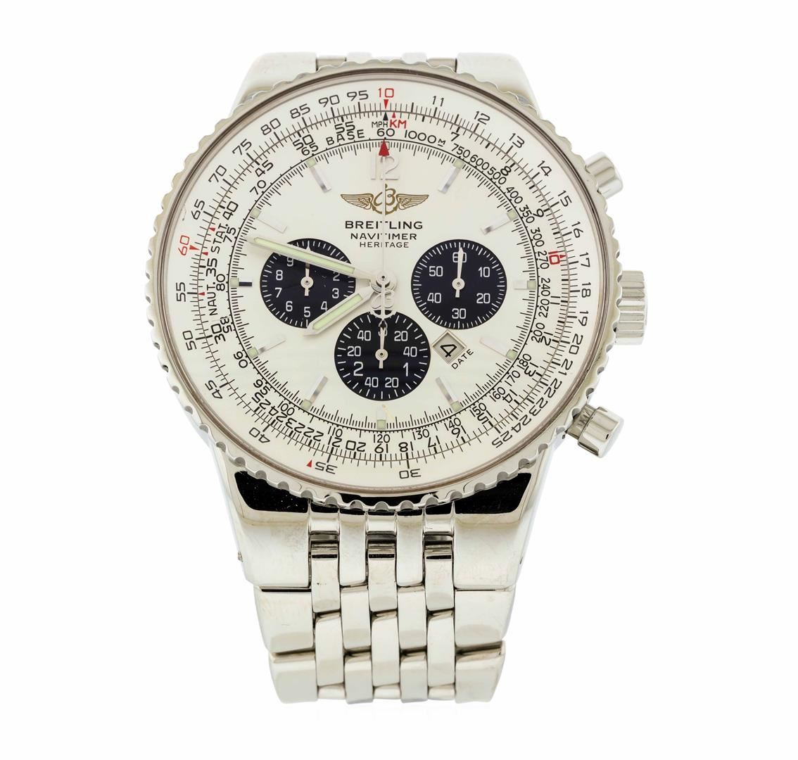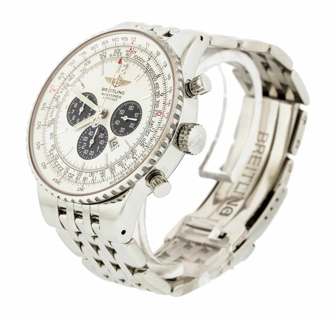 One Breitling Navitimer Heritage Silver Dial Automatic Mens Watch A35340. Excellent used Condition. Automatic self-winding officially certified chronometer movement. Chronograph function. Stainless steel case 43.0 mm in diameter. Stainless steel screwed-down crown and pushers. Scratch resistant sapphire crystal. Silver dial. Luminescent stainless steel outlined hour/minute hands, stainless steel sweeping seconds hand with red pointer, stainless steel applied index hour markers with luminescent dot on tip, small seconds subdial at 3 o'clock, chronograph subdials at 6 and 9 o'clock, tachymeter scale on outer edge, small date window between 4 and 5 o'clock aperture. Stainless steel bidirectional rotating bezel. Stainless steel pilot bracelet with flip-lock clasp.