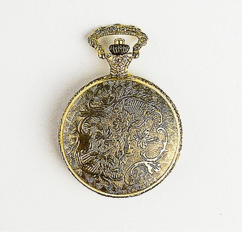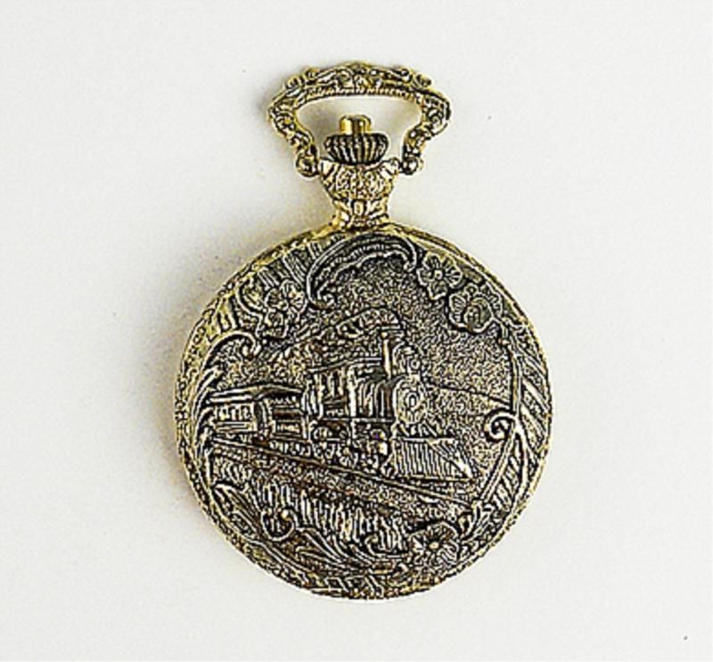 Men's Carved Train Pocket Watch. The Watch Is Ornately Carved On The Front And Back. It Has A White Face And Black Numbers And Accented With Red Flowers. It Is Sold As Is.