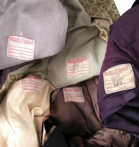 Total of 10 pieces of Men's 1800s tailcoats, vests, and pants. A majority of the costumes have the Western Costume Company tags included on each costume. An amazing collection of costumes to own from the 1800 period.