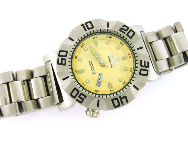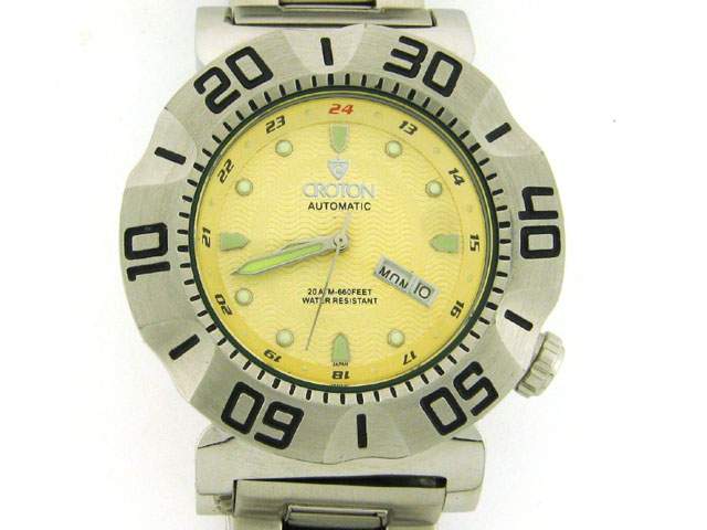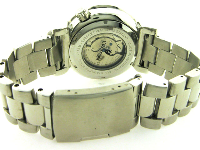 This is a Men's Croton Automatic Watch CA301184SSYL (VORTEZ Collection Series) with the following features: Stainless Steel case; 46 mm case size; Bracelet band material; Sphereulite (Sapphire Coated Mineral) Crystal; Luminous Hands and Markers on Dial; Automatic Japan; Day Date Function; and Water resistant.