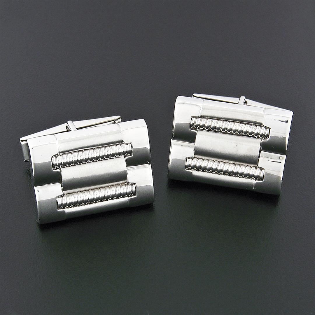 A designer L&M 14k white gold cuuflinks. These cuff links have a swivel design with a clearance of 12.5mm, weigh a total of 14.48 grams, and the front panels measure 15.25x20.97mm.