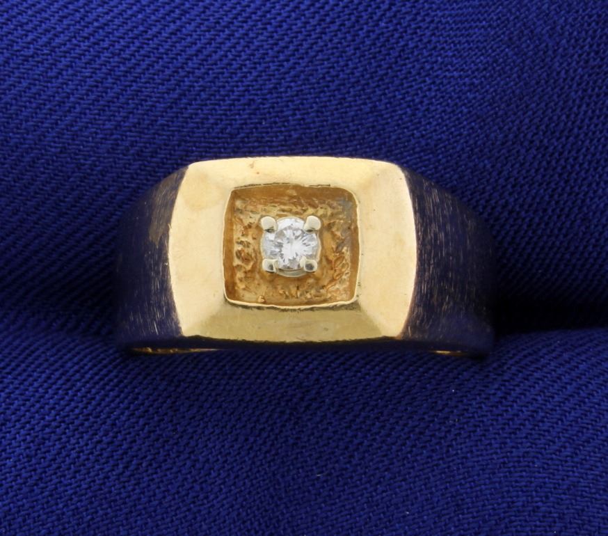 In 14K yellow gold, the ring contains one .1ct high quality diamond VS Clarity/H color. Size 9 7.6g