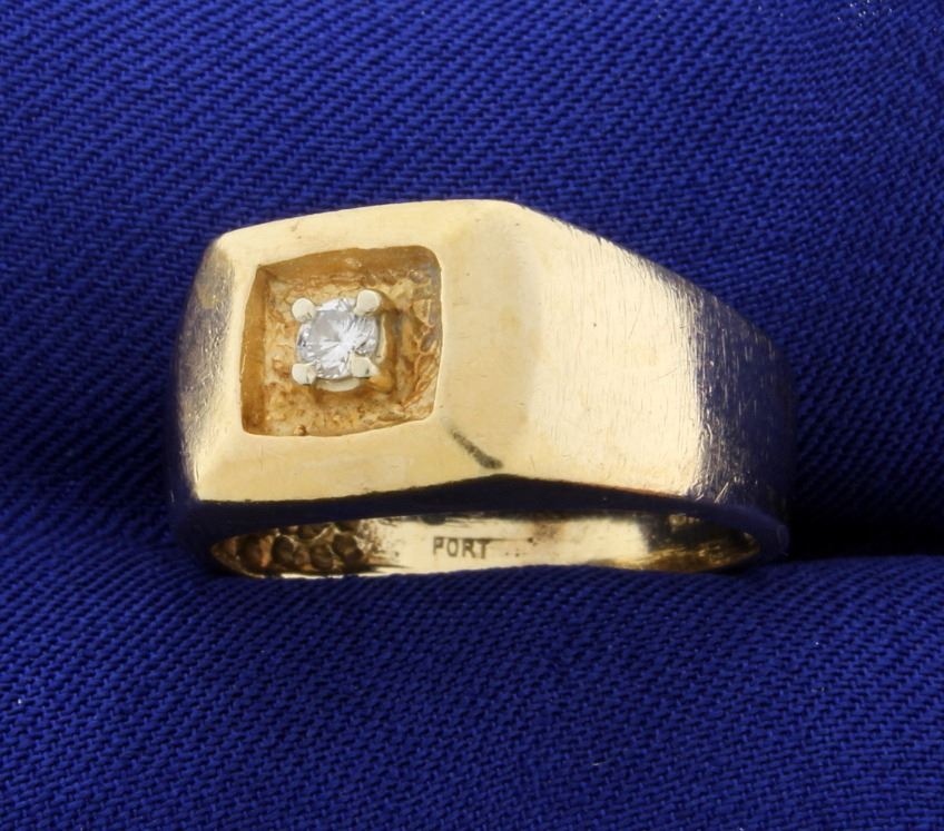 In 14K yellow gold, the ring contains one .1ct high quality diamond VS Clarity/H color. Size 9 7.6g