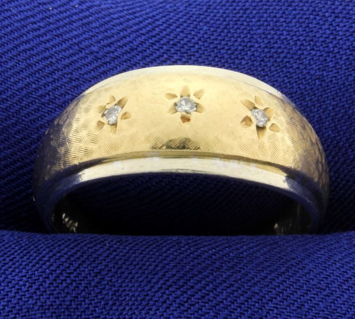 In 14K yellow & white gold, the ring contains three .02ct diamonds with SI clarity/ H color. Size 11 1/4 6.4g