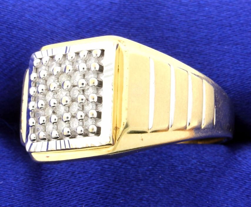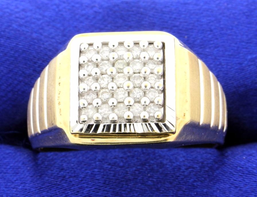 This Men's Diamond ring is set with 25 brilliant cut diamonds that total a 1/2 carat. Diamond clarity is SI/I1 and H-I-J color. The diamonds are set on a 10k white gold plate which is set onto a 10k yellow gold mounting. Size 13 1/2 8.5g