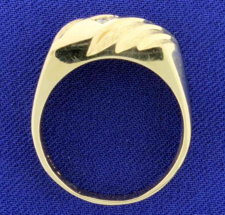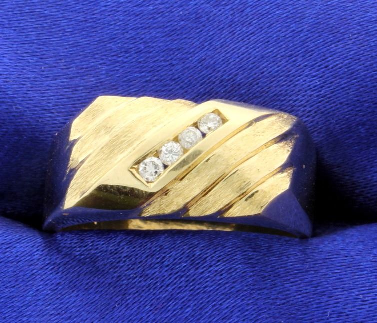 In 14K yellow gold, there are four .03ct round high quality diamonds - SI clarity/H color. Size 10 1/4 9.3g