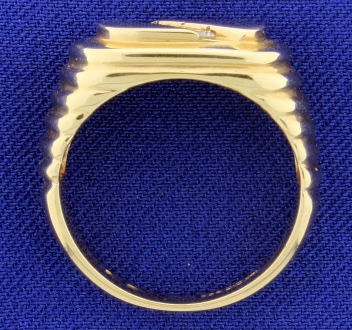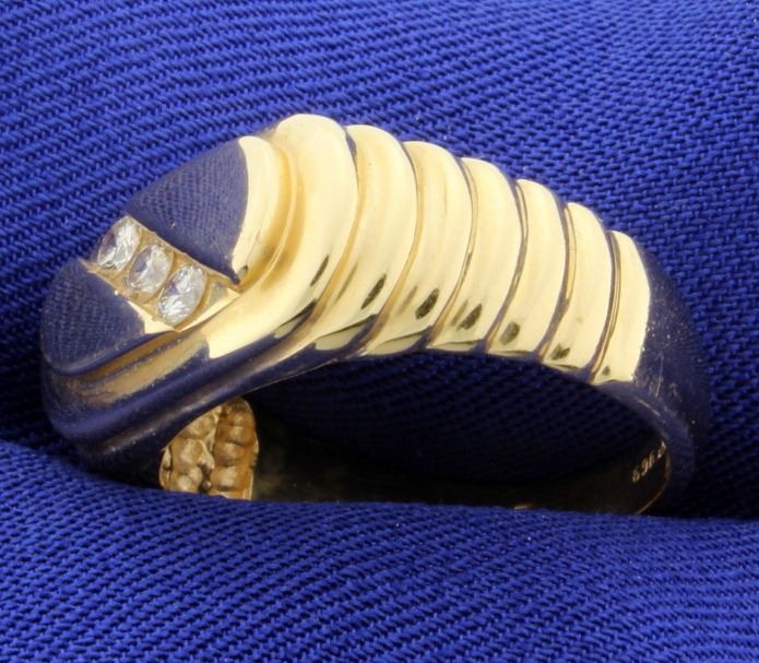 In 14K yellow gold, there are three .09ct round high quality diamonds. Size 9 7.7g