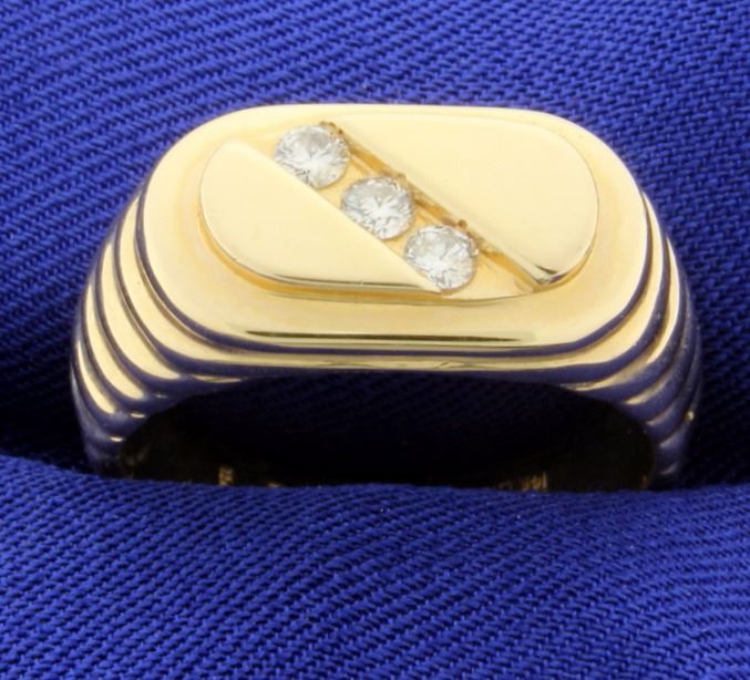 In 14K yellow gold, there are three .09ct round high quality diamonds. Size 9 7.7g