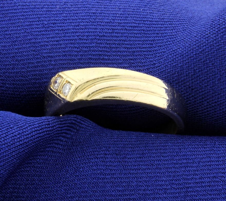 The ring is 14K yellow gold and contains two round .05ct diamonds with exceptional VS clarity/F color. Size 10 5.8g