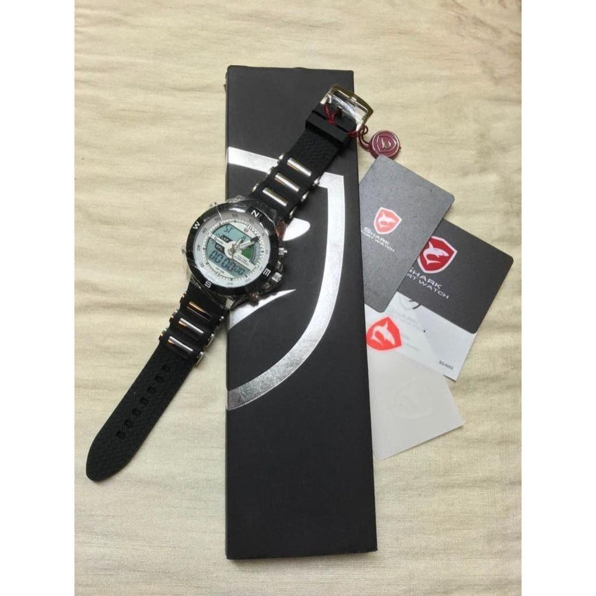 Men's digital sport chronograph quartz wristwatch. SHARK brand stainless steel, water resistant, Caliber LC2, dual time alarm chrono. 2" case size with durable rubber & stainless band. Comes in original box with tags, booklet & warranty info.Â