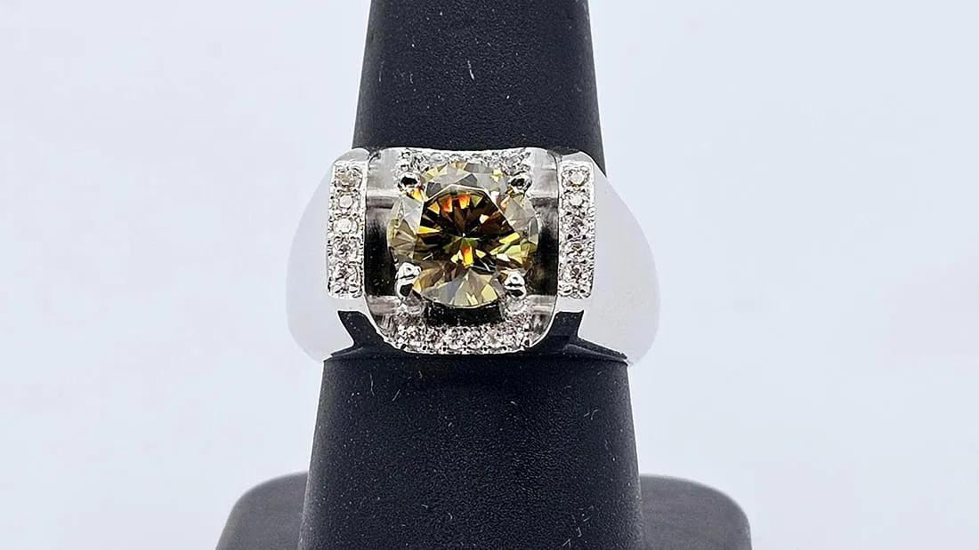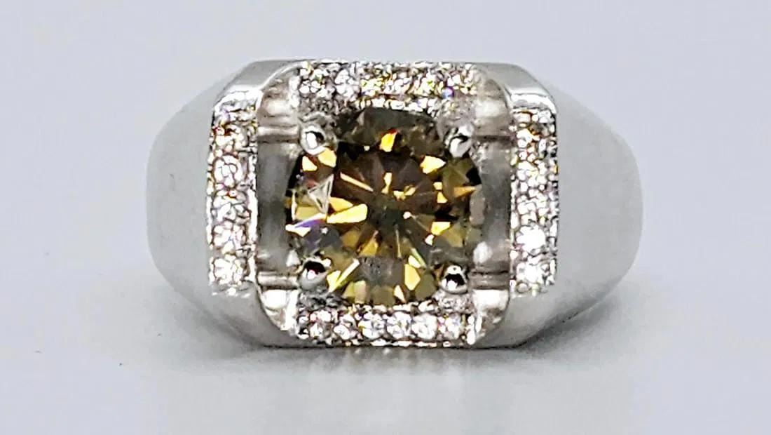 This 3.45 Ct VVs1 Center Stone Is Amber Green In Color. It is a Brilliant Round Cut Measuring 9 mm. Cut It is near flawless and bursting out with a full spectrum of colors. This Moissanite Ring is complimented with 25 individual accent stones. Mounted in .925 solid sterling silver with 14 Kt White Gold Overlay, which gives the ring its high polish and shine. With a refractive index of 2.65-2.69 exhibits more fire and brilliance than a natural diamond. Ring size 9.Total gram wt.is approx. 6.2 grams.