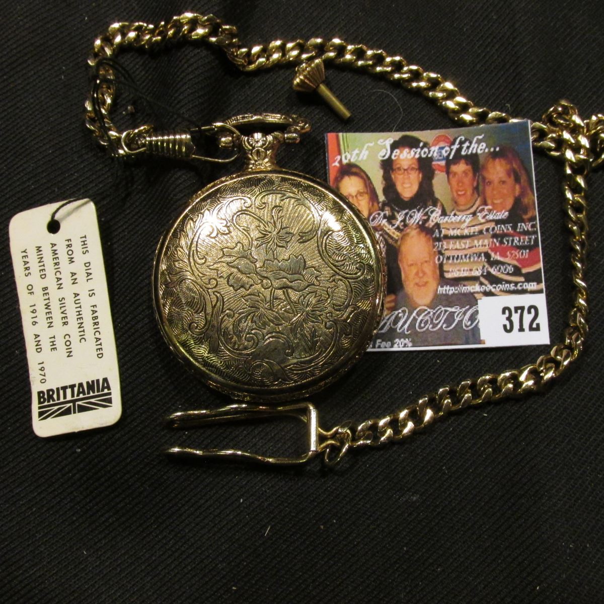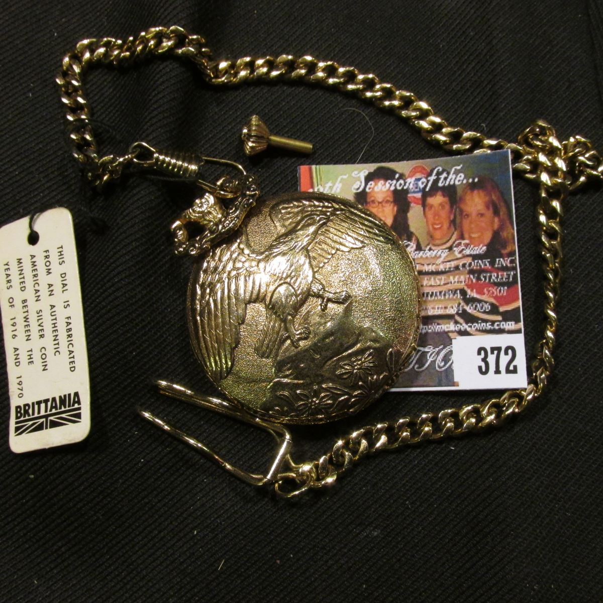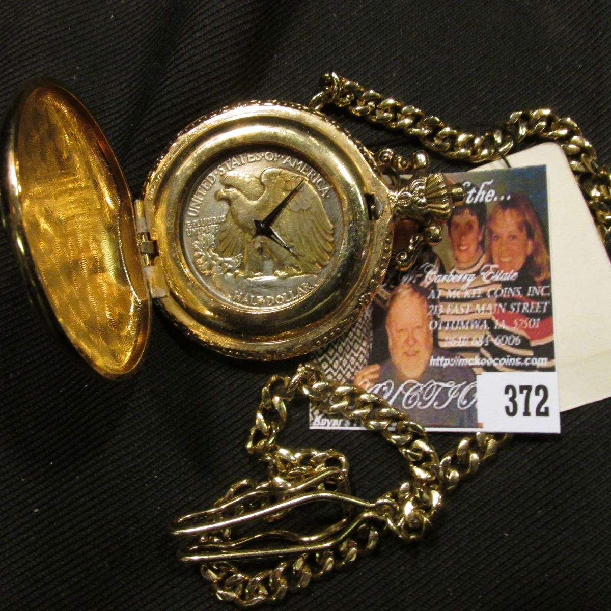 Men's Hunting case watch with Eagle design and watch chain; dial is made with a Gold highlighted Walking Liberty Half Dollar exhibiting the reverse with Eagle. No crystal and appears to need battery.