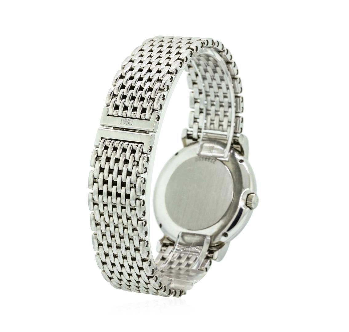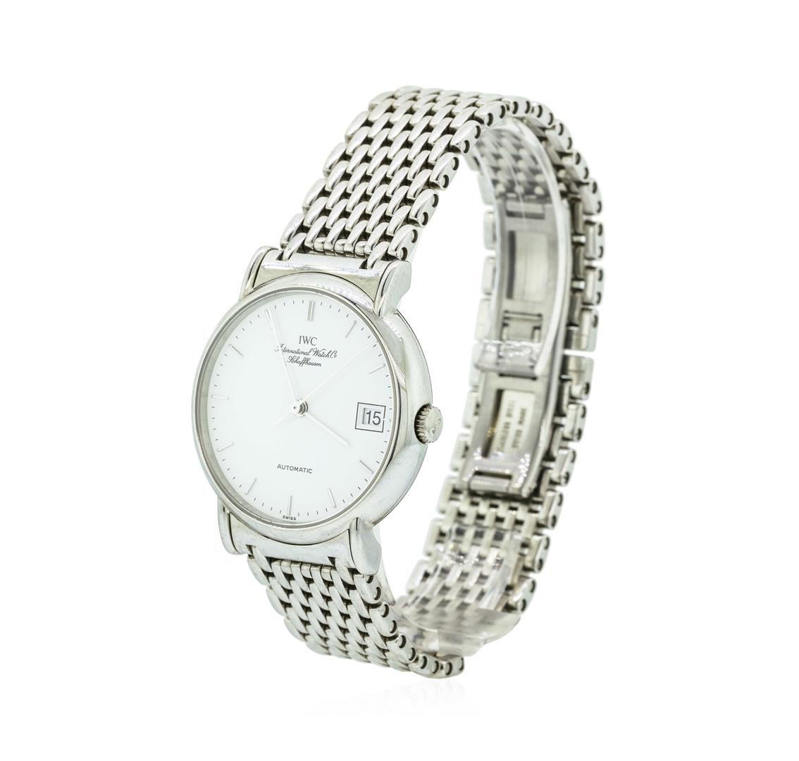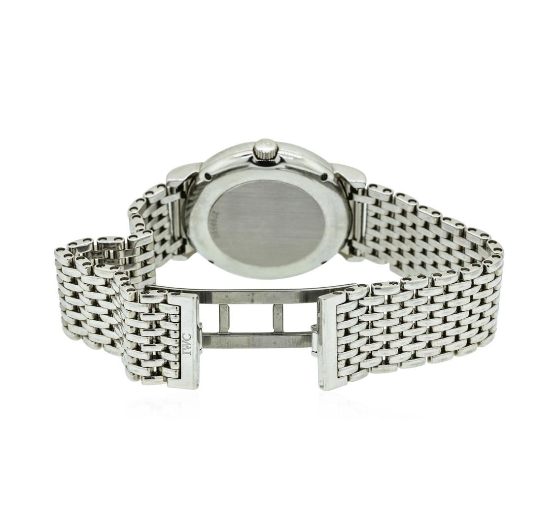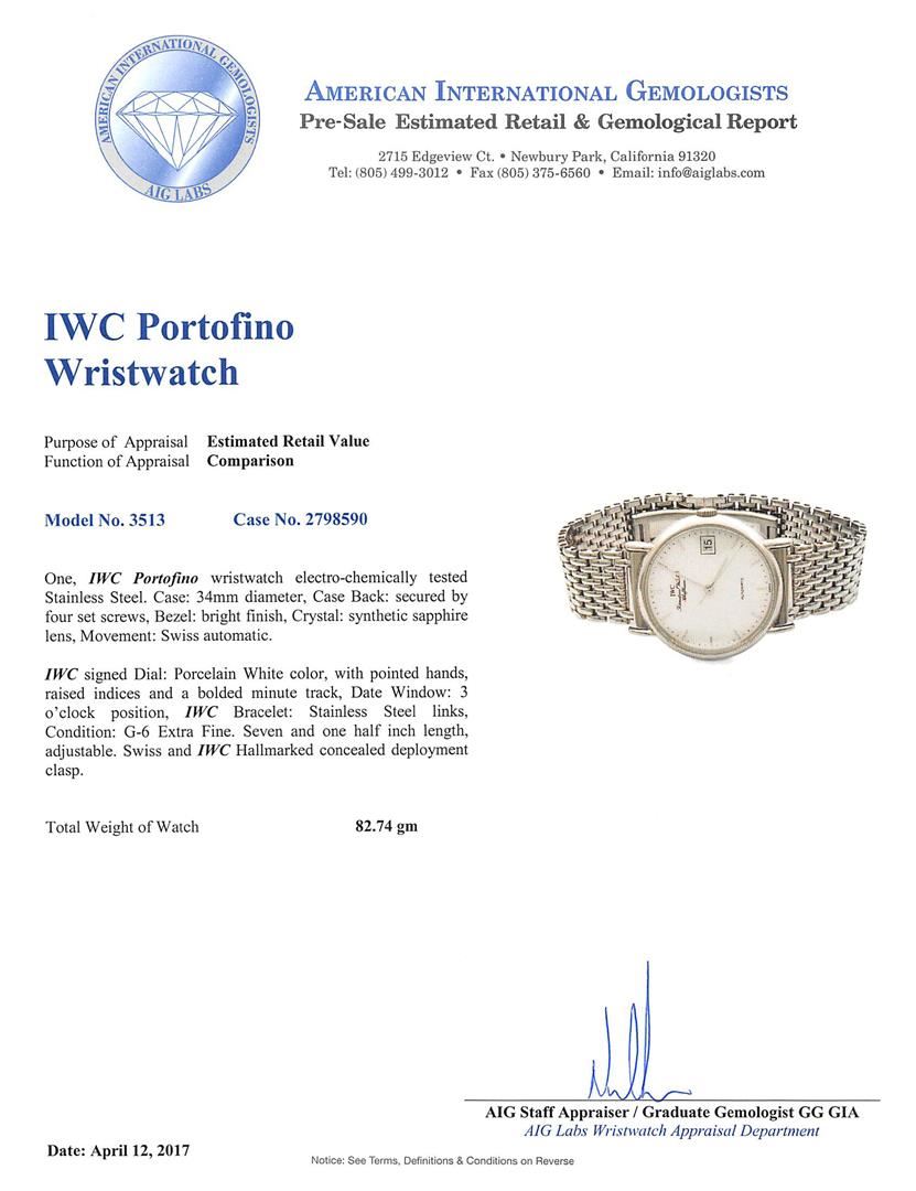 One, IWC Portofino wristwatch electro-chemically tested Stainless Steel. Case: 34mm diameter, Case Back: secured by four set screws, Bezel: bright finish, Crystal: synthetic sapphire lens, Movement: Swiss automatic. IWC signed Dial: Porcelain White color, with pointed hands, raised indices and a bolded minute track, Date Window: 3 o'clock position, IWC Bracelet: Stainless Steel links, Condition: G-6 Extra Fine. Seven and one half inch length, adjustable. Swiss and IWC Hallmarked concealed deployment clasp. Total Weight of Watch 82.74gm. AIG Appraised.