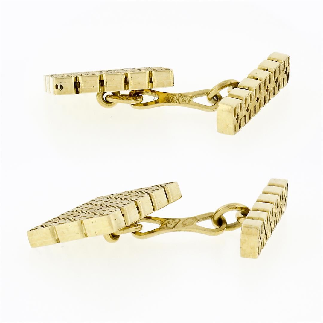 A vintage italain solid 18k yellow gold men's cufflinks. These cuff links have a chain bar design with a clearance of 20.36mm, weigh a total of 14.92 grams, and the front panels measure 15.67x13.41x2.35mm.
