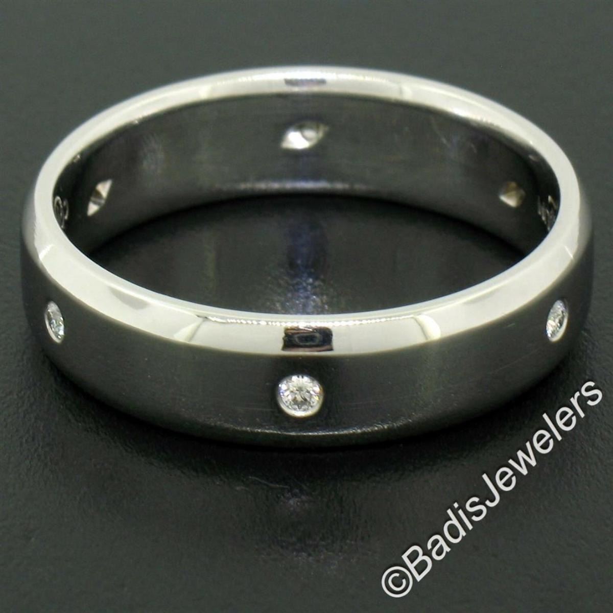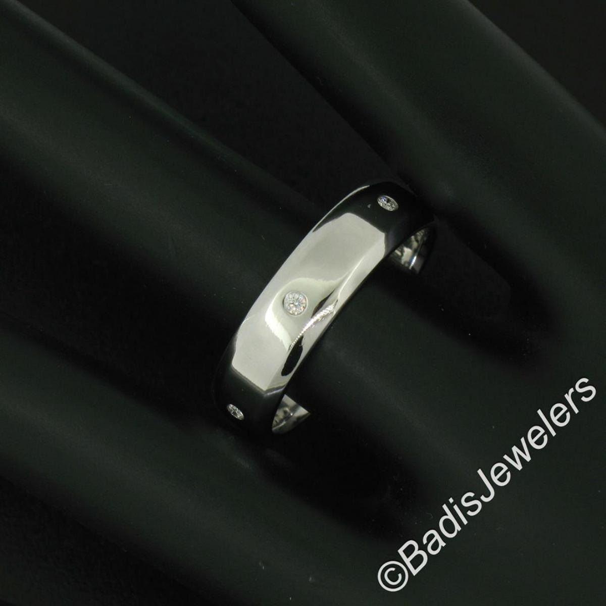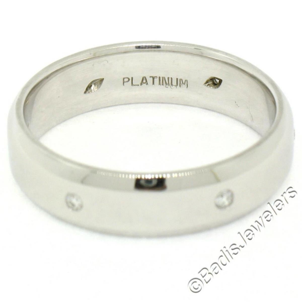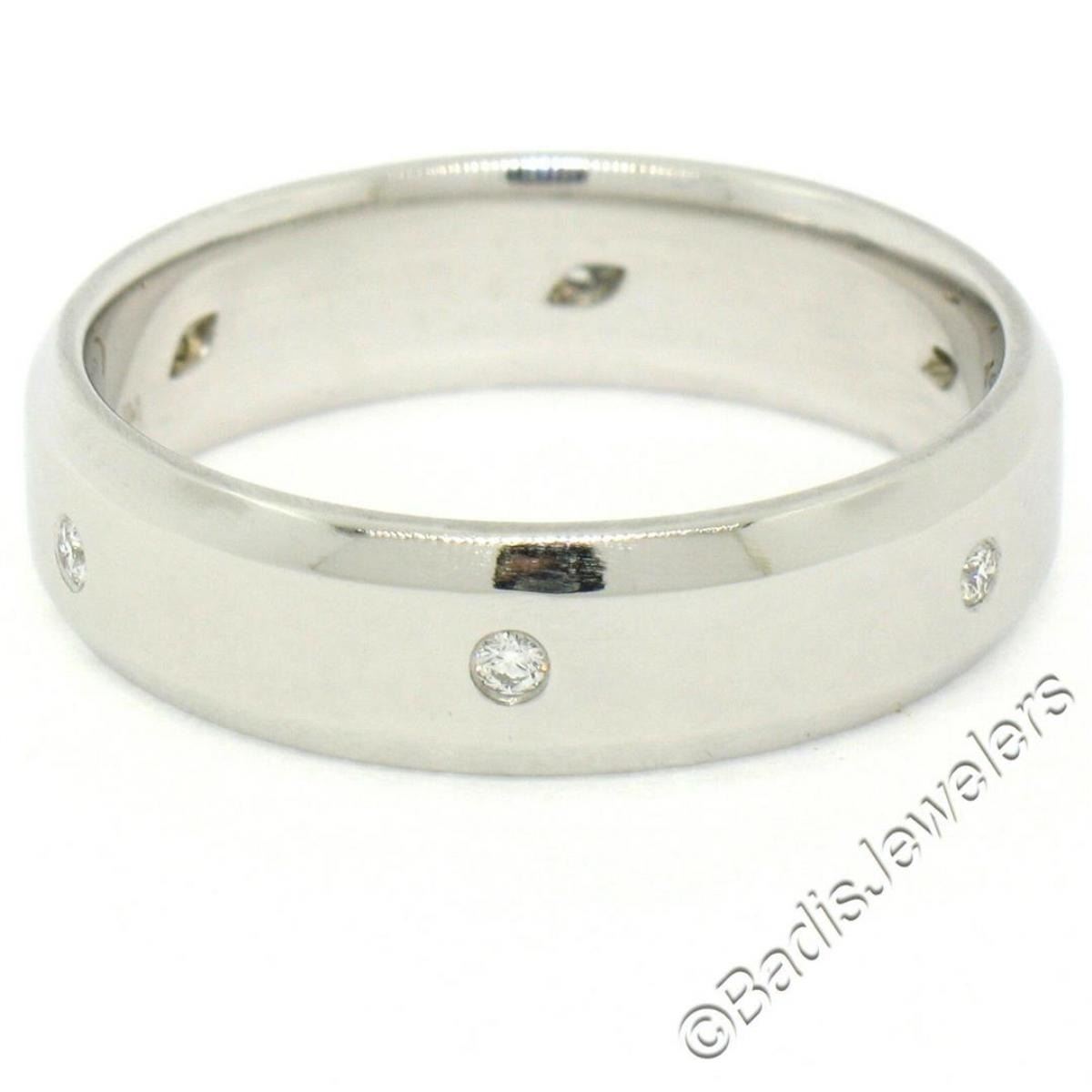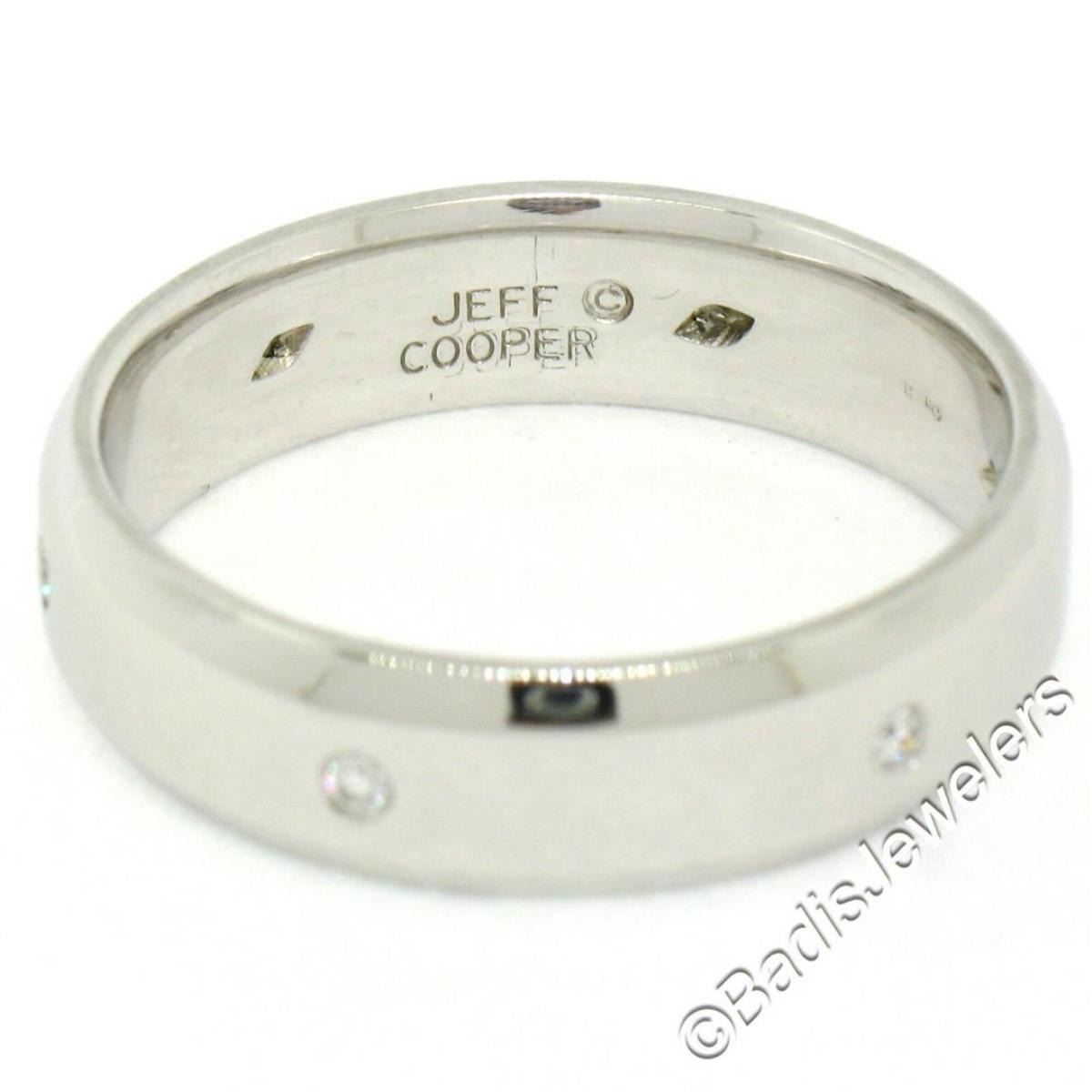 A like new men's platinum beveled band ring by Jeff Cooper burnish set with 0.12ctw of round diamonds. The ring is size 10, weighs a total of 11.7 grams, and measures 5.8mm wide.