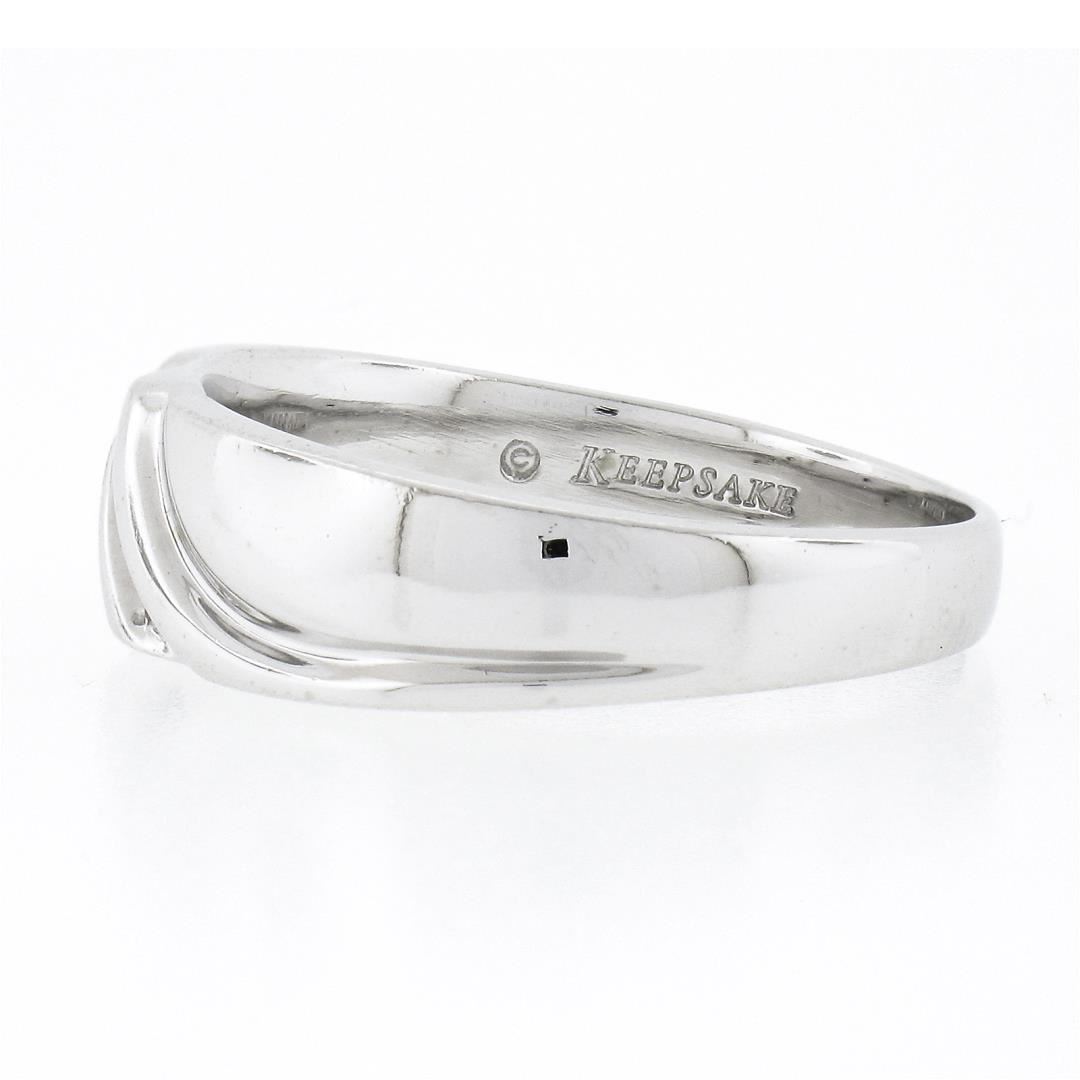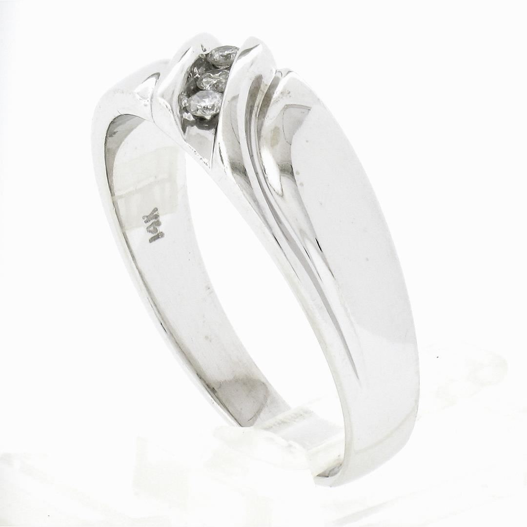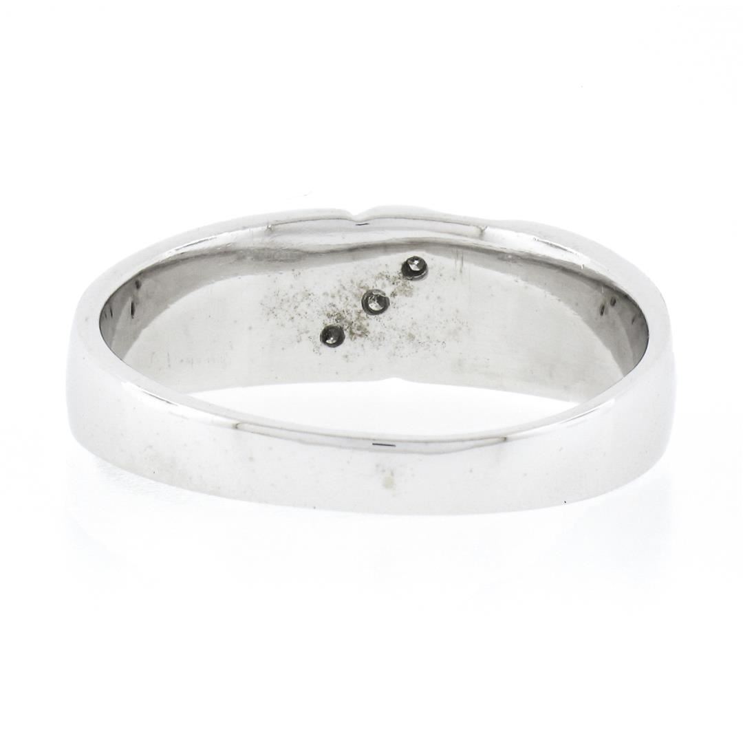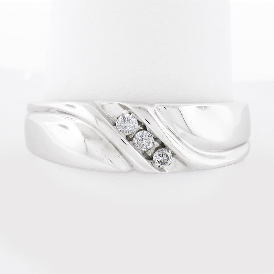 A solid 14k white gold men's band ring, with 3 round brilliant cut natural diamonds (G - I1 ; 0.10ctw). The ring is size 11.5, weighs a total of 6.59 grams, and measures 7.30mm wide.