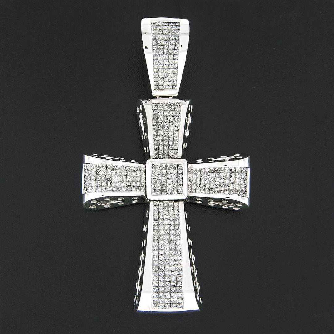 A solid 14k white gold large cross pendant, with 376 princess cut natural diamonds (H/I- VS2/SI2; 11.28ctw). The pendant weighs a total of 55.80 grams, measures 83.3x47.8mm including the bail, and the inside of the bail measures 15.1x11.6mm.