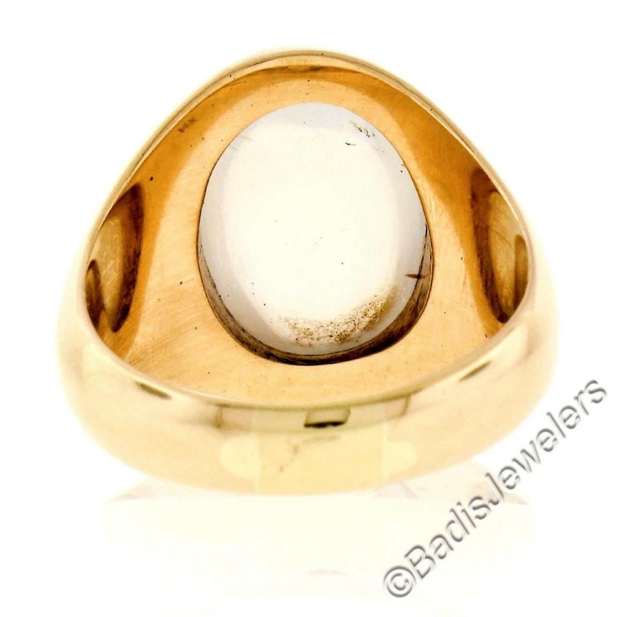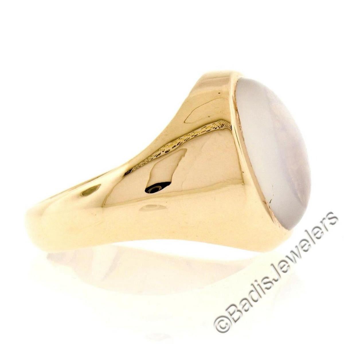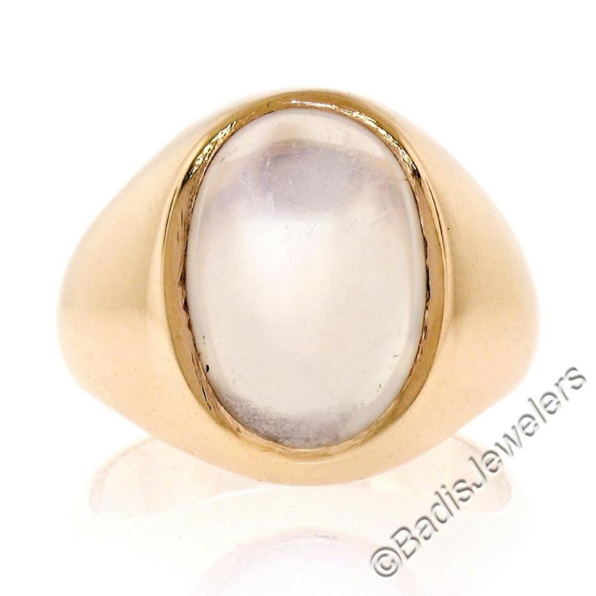 A men's 14kt yellow gold 14.5x10.0mm oval blue moonstone solitaire ring. The ring is size 8.0, weighs a total of 10.27 grams, and measures 17.2mm wide.